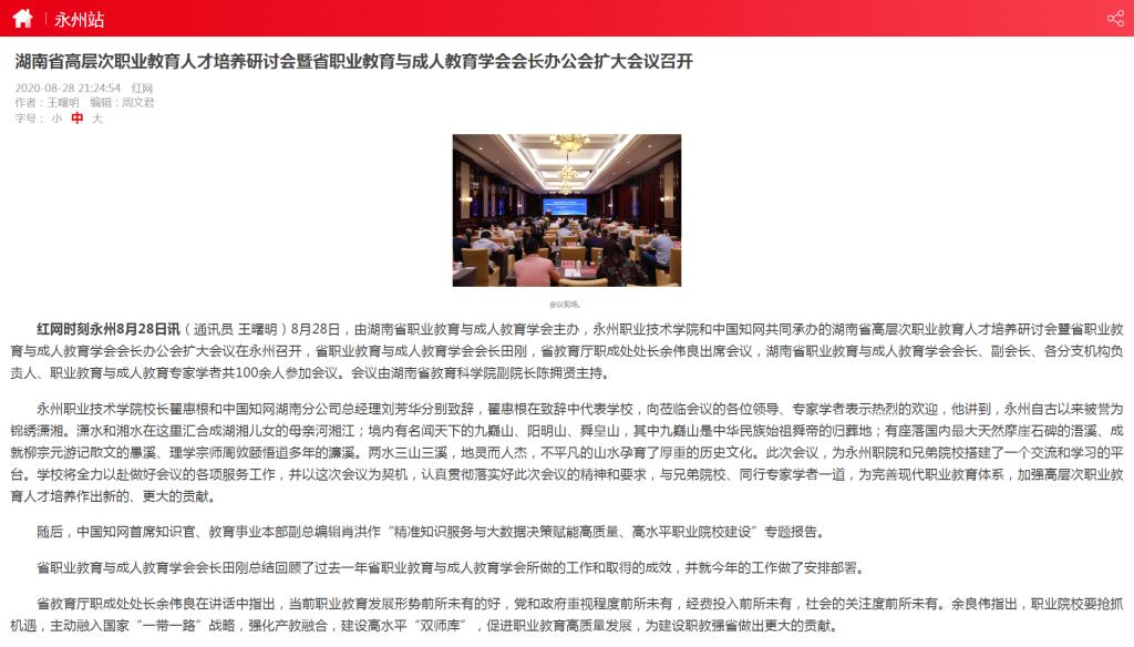 红网时刻永州8月28日讯(通讯员 王曙明)8月28日,由湖南省职业教育与成人教育学会主办,永州职业技术学院和中国知网共同承办的湖南省高层次职业教育人才培养研讨会暨省职业教育与成人教育学会会长办公会扩大会议在永州召开,省职业教育与成人教育学会会长田刚,省教育厅职成处处长余伟良出席会议,湖南省职业教育与成人教育学会会长、副会长、各分支机构负责人、职业教育与成人教育专家学者共100余人参加会议。会议由湖南省教育科学院副院长陈拥贤主持。