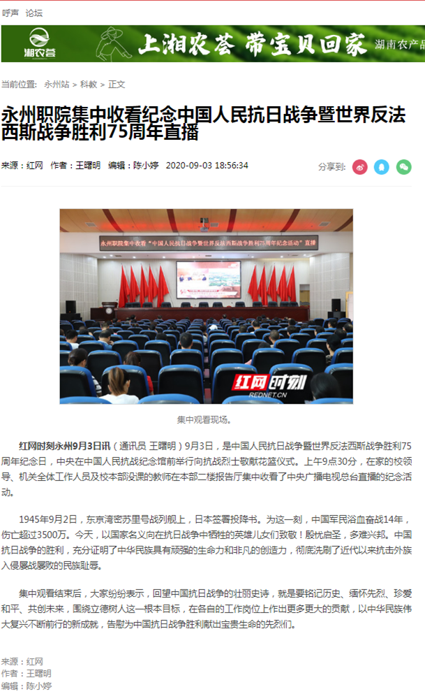 红网时刻永州9月3日讯(通讯员 王曙明)9月3日,是中国人民抗日战争暨世界反法西斯战争胜利75周年纪念日,中央在中国人民抗战纪念馆前举行向抗战烈士敬献花篮仪式。上午9点30分,在家的校领导、机关全体工作人员及校本部没课的教师在本部二楼报告厅集中收看了中央广播电视总台直播的纪念活动。