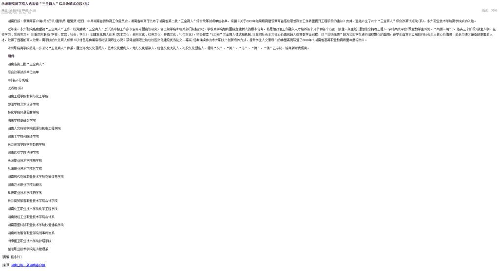 湖南日报·新湖南客户端9月3日讯(通讯员 唐爱武)近日,中共湖南省委教育工作委员会、湖南省教育厅公布了湖南省第二批“三全育人”综合改革试点单位名单,根据《关于2020年继续培育建设湖南省高校思想政治工作质量提升工程项目的通知》安排,遴选产生了20个“三全育人”综合改革试点院(系),永州职业技术学院商学院成功入选。