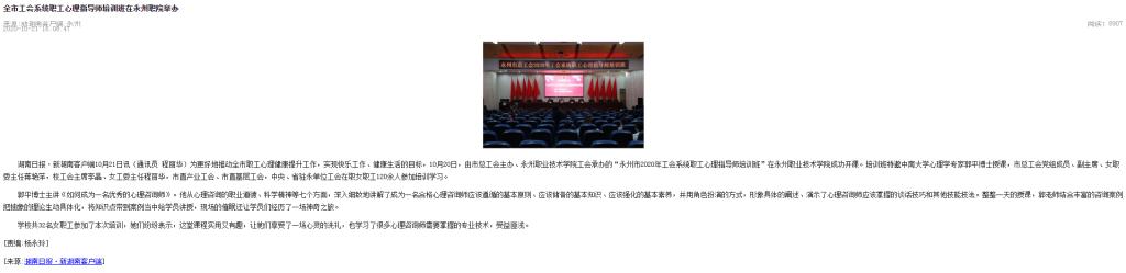 湖南日报·新湖南客户端10月21日讯(通讯员 程丽华)为更好地推动全市职工心理健康提升工作,实现快乐工作、健康生活的目标,10月20日,由市总工会主办、永州职业技术学院工会承办的“永州市2020年工会系统职工心理指导师培训班”在永州职业技术学院成功开课。培训班特邀中南大学心理学专家郭平博士授课,市总工会党组成员、副主席、女职委主任蒋艳萍,校工会主席李晶、女工委主任程丽华,市直产业工会、市直基层工会,中央、省驻永单位工会在职女职工120余人参加培训学习。