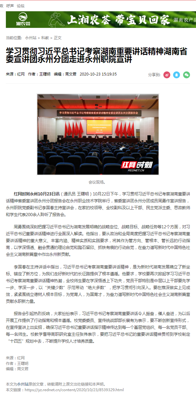 红网时刻永州10月23日讯(通讯员 王曙明)10月22日下午,学习贯彻习近平总书记考察湖南重要讲话精神省委宣讲团永州分团报告会在永州职业技术学院举行,省委宣讲团永州分团成员周勇作宣讲报告,永州职院党委副书记李国春主持宣讲会,在家的校领导、全校副科及以上干部、民主党派主委、思政教师和学生代表200余人聆听了报告会。