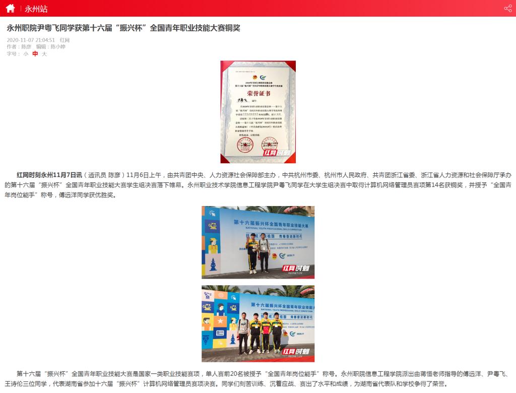 红网时刻永州11月7日讯(通讯员 陈彦)11月6日上午,由共青团中央、人力资源社会保障部主办,中共杭州市委、杭州市人民政府、共青团浙江省委、浙江省人力资源和社会保障厅承办的第十六届“振兴杯”全国青年职业技能大赛学生组决赛落下帷幕。永州职业技术学院信息工程学院尹粤飞同学在大学生组决赛中取得计算机网络管理员赛项第14名获铜奖,并授予“全国青年岗位能手”称号,傅远洋同学获优胜奖。