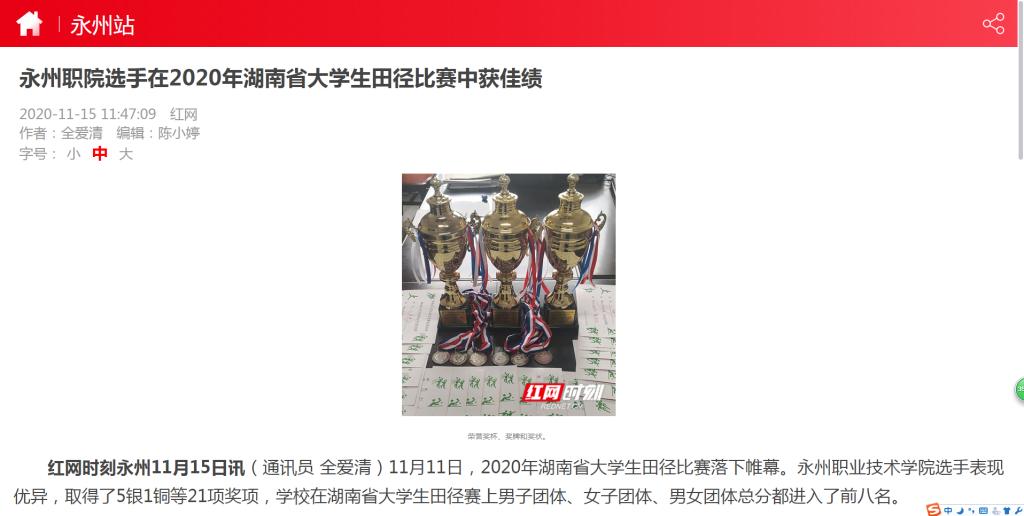 红网时刻永州11月15日讯(通讯员 全爱清)11月11日,2020年湖南省大学生田径比赛落下帷幕。永州职业技术学院选手表现优异,取得了5银1铜等21项奖项,学校在湖南省大学生田径赛上男子团体、女子团体、男女团体总分都进入了前八名。