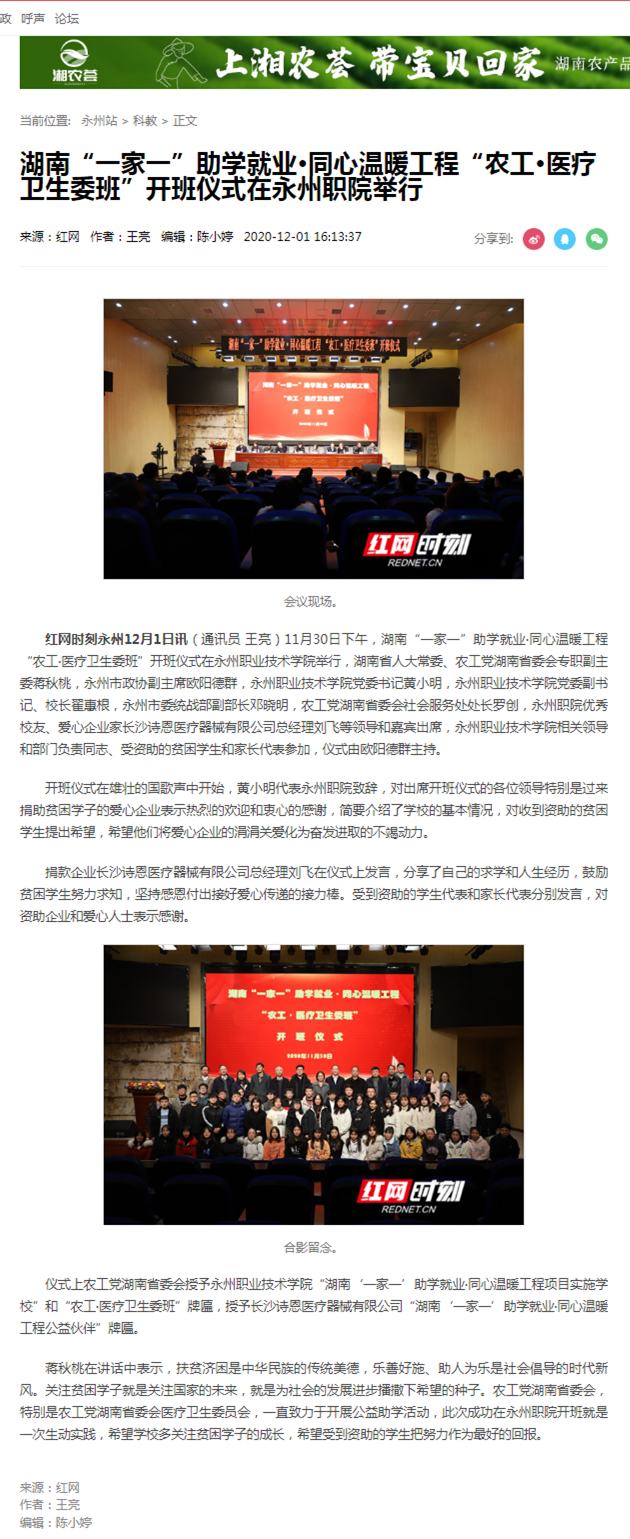 红网时刻永州12月1日讯(通讯员 王亮)11月30日下午,湖南“一家一”助学就业·同心温暖工程“农工·医疗卫生委班”开班仪式在永州职业技术学院举行,湖南省人大常委、农工党湖南省委会专职副主委蒋秋桃,永州市政协副主席欧阳德群,永州职业技术学院党委书记黄小明,永州职业技术学院党委副书记、校长翟惠根,永州市委统战部副部长邓晓明,农工党湖南省委会社会服务处处长罗创,永州职院优秀校友、爱心企业家长沙诗恩医疗器械有限公司总经理刘飞等领导和嘉宾出席,永州职业技术学院相关领导和部门负责同志、受资助的贫困学生和家长代表参加,仪式由欧阳德群主持。
