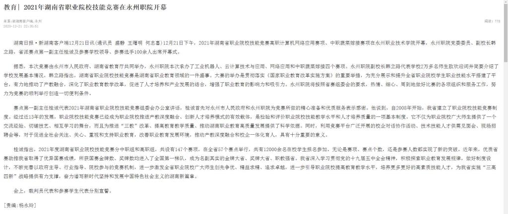 湖南日报·新湖南客户端12月21日讯(通讯员 盛静 王曙明 何志喜)12月21日下午,2021年湖南省职业院校技能竞赛高职计算机网络应用赛项、中职蔬菜嫁接赛项在永州职业技术学院开幕,永州职院党委委员、副校长韩立路,省派赛点第一副主任桂诚及参赛学校领导、参赛选手100余人出席开幕式。
