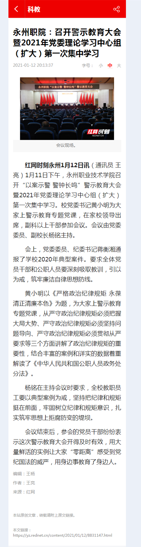 红网时刻永州1月12日讯(通讯员 王亮)1月11日下午,永州职业技术学院召开“以案示警 警钟长鸣”警示教育大会暨2021年党委理论学习中心组(扩大)第一次集中学习。校党委书记黄小明为大家上警示教育专题党课,在家校领导出席,副科以上干部参加会议。会议由党委委员、副校长杨铭主持。
