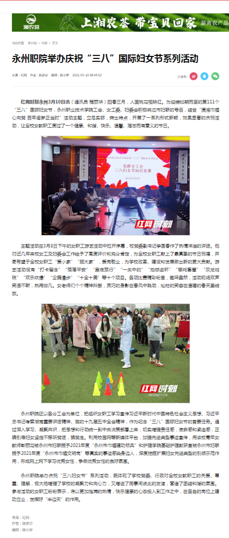 永州职院还以各分工会为单位,把组织女职工学习宣传习近平新时代中国特色社会主义思想、习近平总书记考察湖南重要讲话精神、党的十九届五中全会精神,作为纪念“三八”国际妇女节的首要任务。通过深入学习、凝聚共识,把思想和行动统一到中央决策部署上来,切实增强责任感,使命感和紧迫感,正确引导妇女坚定不移听党话,跟党走。利用校园网等新媒体平台,加强先进典型事迹宣传,用该校青年女教师彭丽花被永州市妇联授予2021年度“永州市巾帼建功标兵”和护理学院基础护理教研室被永州市妇联授予2021年度“永州市巾帼文明岗”等真实的事迹感染身边人,深度挖掘扩展妇女先进典型的引领示范作用,形成网上网下学习优秀女性,争做优秀女性的良好氛围。