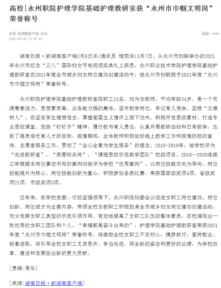 湖南日报·新湖南客户端3月8日讯(通讯员 程丽华)3月7日,从永州市妇联举办的2021年永州市纪念“三八”国际妇女节电视颁奖典礼上获悉,永州职业技术学院护理学院基础护理教研室在2021年度全市城乡妇女岗位建功创建活动中,被永州市妇联授予2021年度“永州市巾帼文明岗”荣誉称号。