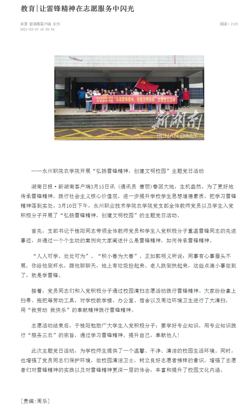 ——永州职院农学院开展“弘扬雷锋精神,创建文明校园”主题党日活动