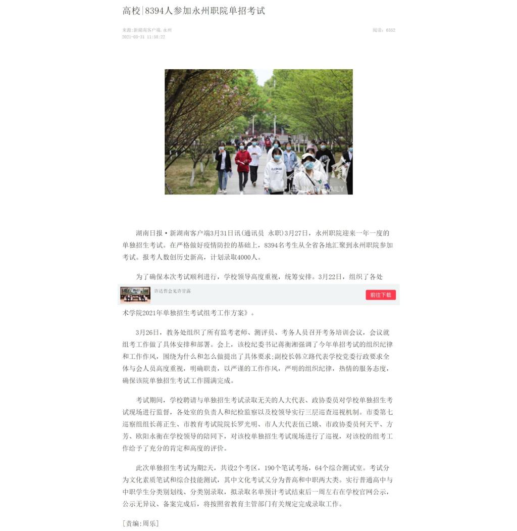 湖南日报·新湖南客户端3月31日讯(通讯员 永职)3月27日,永州职院迎来一年一度的单独招生考试。在严格做好疫情防控的基础上,8394名考生从全省各地汇聚到永州职院参加考试。报考人数创历史新高,计划录取4000人。