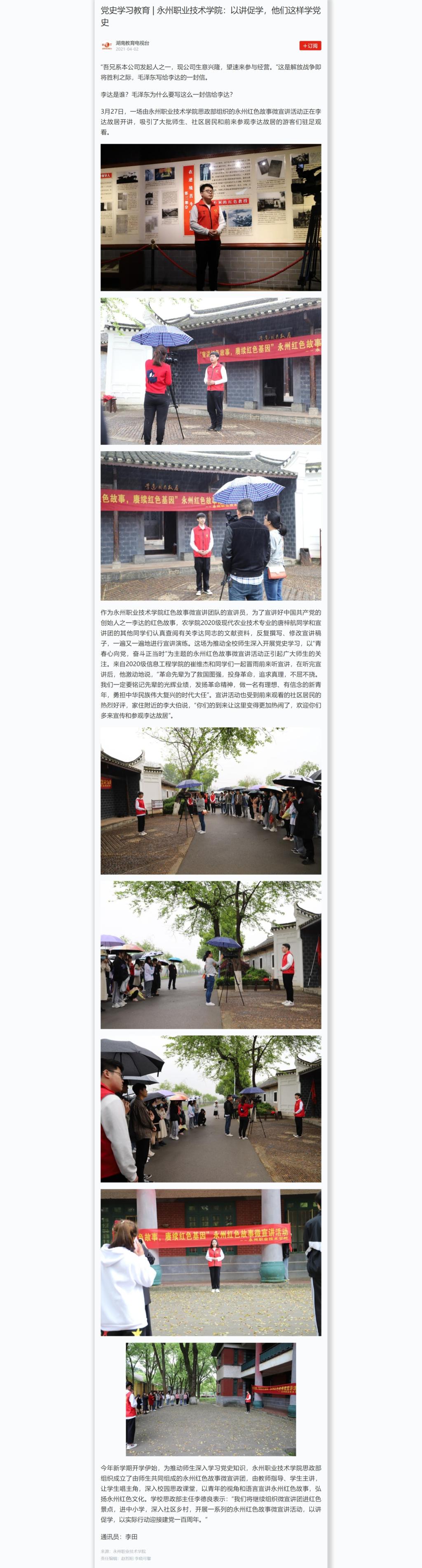 今年新学期开学伊始,为推动师生深入学习党史知识,永州职业技术学院思政部组织成立了由师生共同组成的永州红色故事微宣讲团,由教师指导、学生主讲,让学生唱主角,深入校园思政课堂,以青年的视角和语言宣讲永州红色故事,弘扬永州红色文化。学校思政部主任李德良表示:“我们将继续组织微宣讲团进红色景点,进中小学,深入社区乡村,开展一系列的永州红色故事微宣讲活动,以讲促学,以实际行动迎接建党一百周年。”