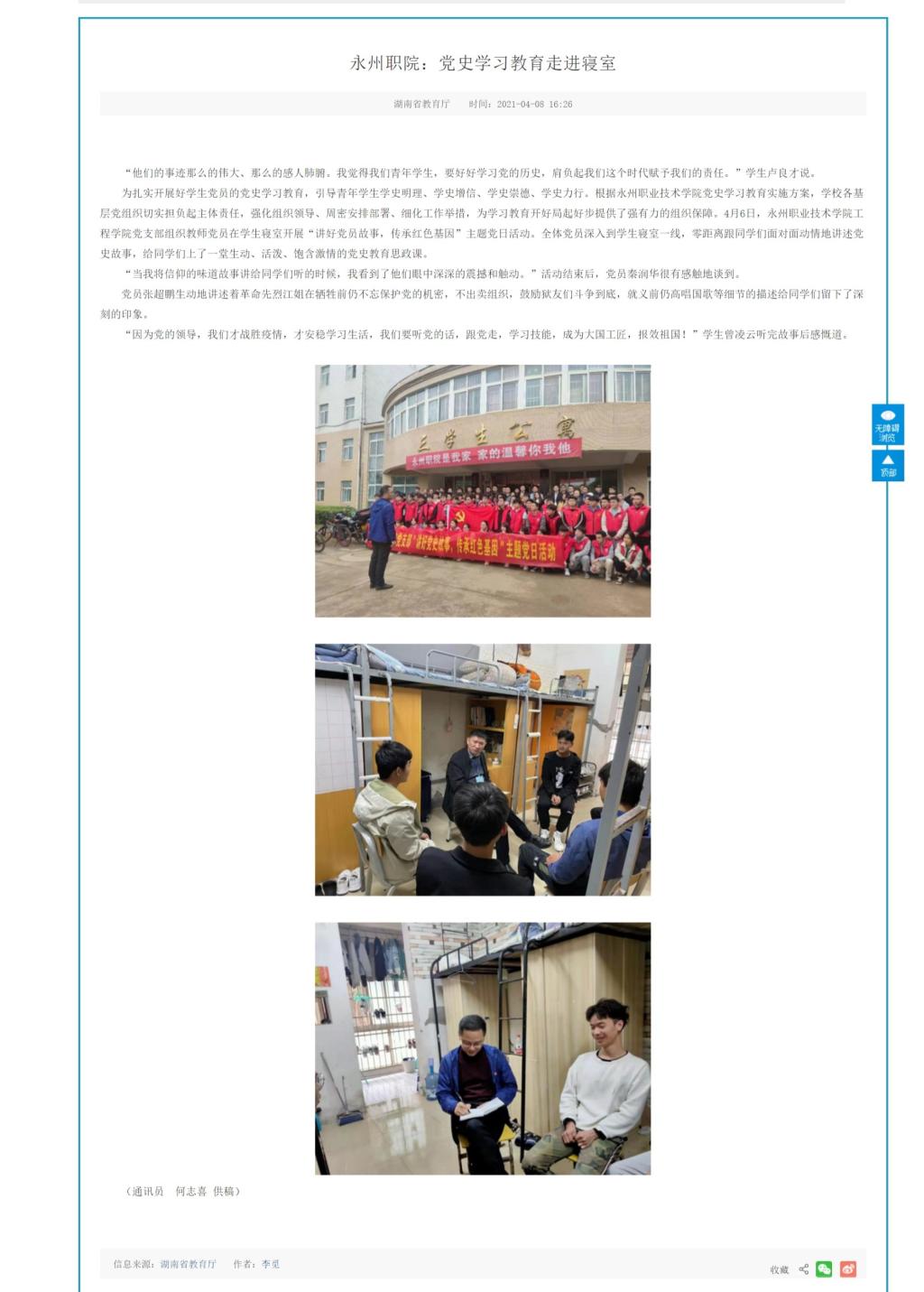 为扎实开展好学生党员的党史学习教育,引导青年学生学史明理、学史增信、学史崇德、学史力行。根据永州职业技术学院党史学习教育实施方案,学校各基层党组织切实担负起主体责任,强化组织领导、周密安排部署、细化工作举措,为学习教育开好局起好步提供了强有力的组织保障。4月6日,永州职业技术学院工程学院党支部组织教师党员在学生寝室开展“讲好党员故事,传承红色基因”主题党日活动。全体党员深入到学生寝室一线,零距离跟同学们面对面动情地讲述党史故事,给同学们上了一堂生动、活泼、饱含激情的党史教育思政课。