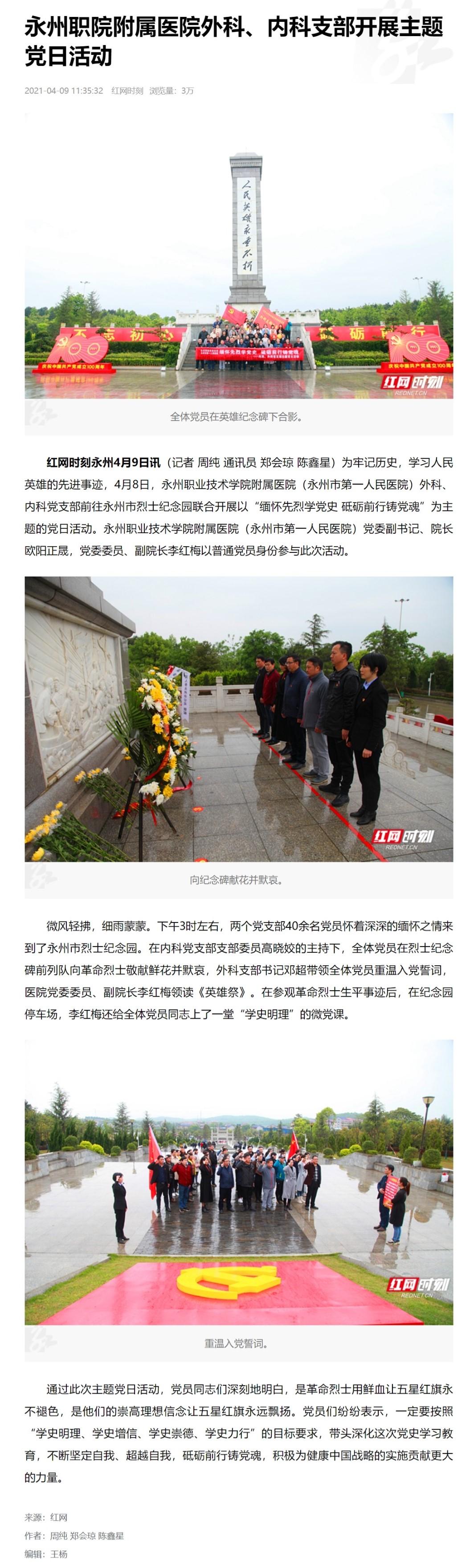 红网时刻永州4月9日讯(记者 周纯 通讯员 郑会琼 陈鑫星)为牢记历史,学习人民英雄的先进事迹,4月8日,永州职业技术学院附属医院(永州市第一人民医院)外科、内科党支部前往永州市烈士纪念园联合开展以“缅怀先烈学党史 砥砺前行铸党魂”为主题的党日活动。永州职业技术学院附属医院(永州市第一人民医院)党委副书记、院长欧阳正晟,党委委员、副院长李红梅以普通党员身份参与此次活动。