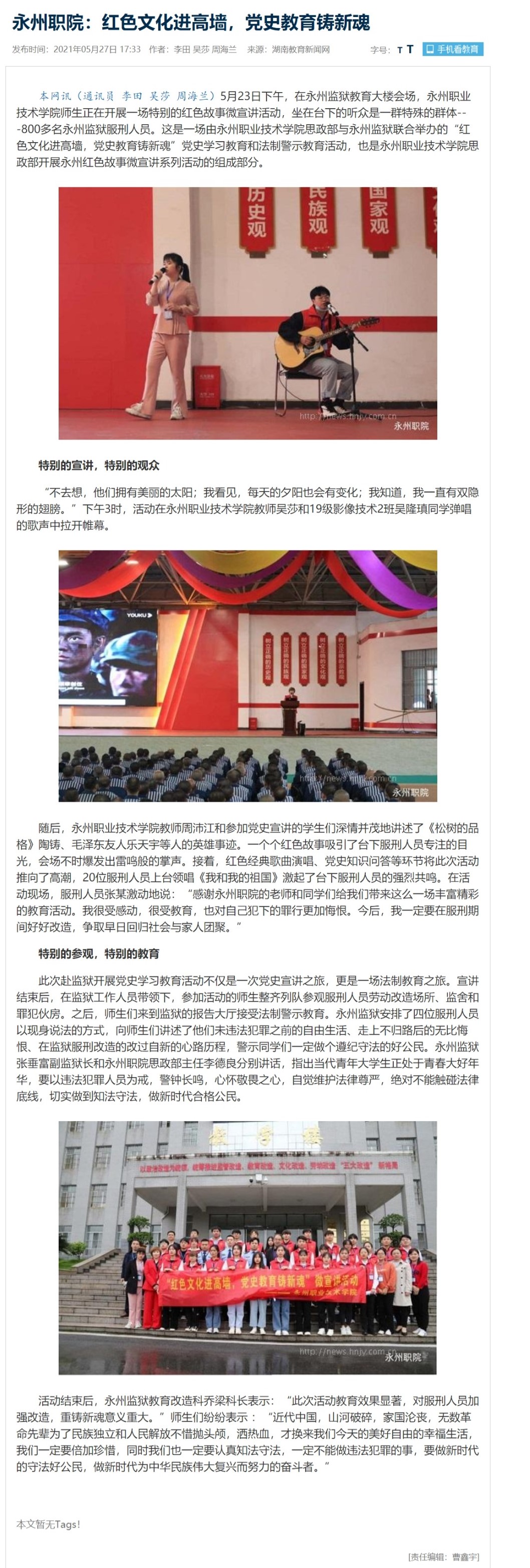 此次赴监狱开展党史学习教育活动不仅是一次党史宣讲之旅,更是一场法制教育之旅。宣讲结束后,在监狱工作人员带领下,参加活动的师生整齐列队参观服刑人员劳动改造场所、监舍和罪犯伙房。之后,师生们来到监狱的报告大厅接受法制警示教育。永州监狱安排了四位服刑人员以现身说法的方式,向师生们讲述了他们未违法犯罪之前的自由生活、走上不归路后的无比悔恨、在监狱服刑改造的改过自新的心路历程,警示同学们一定做个遵纪守法的好公民。永州监狱张垂富副监狱长和永州职院思政部主任李德良分别讲话,指出当代青年大学生正处于青春大好年华,要以违法犯罪人员为戒,警钟长鸣,心怀敬畏之心,自觉维护法律尊严,绝对不能触碰法律底线,切实做到知法守法,做新时代合格公民。