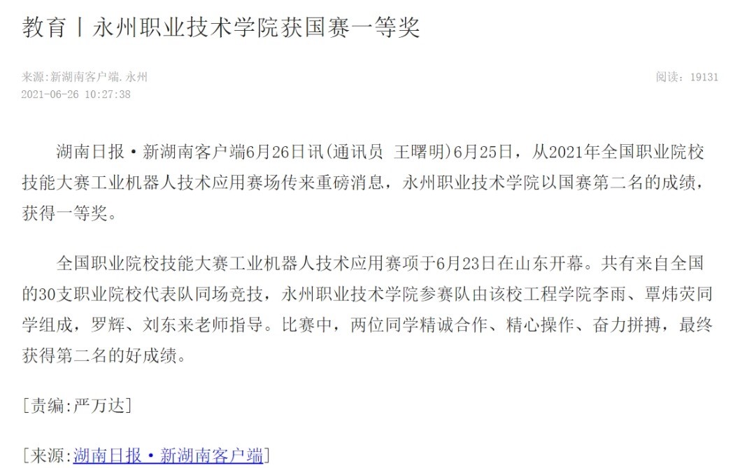 湖南日报·新湖南客户端6月26日讯(通讯员 王曙明)6月25日,从2021年全国职业院校技能大赛工业机器人技术应用赛场传来重磅消息,永州职业技术学院以国赛第二名的成绩,获得一等奖。
