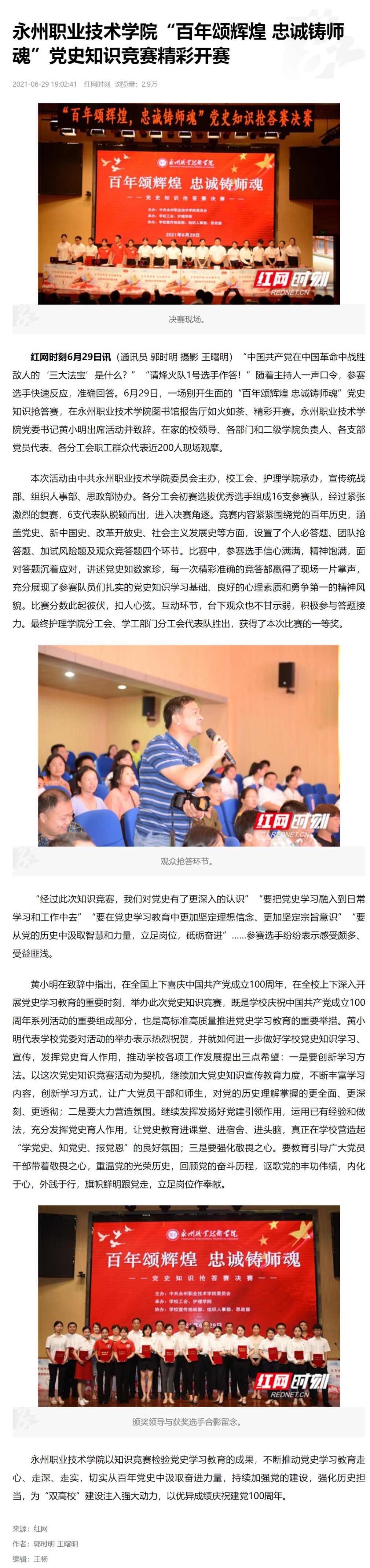 永州职业技术学院以知识竞赛检验党史学习教育的成果,不断推动党史学习教育走心、走深、走实,切实从百年党史中汲取奋进力量,持续加强党的建设,强化历史担当,为“双高校”建设注入强大动力,以优异成绩庆祝建党100周年。