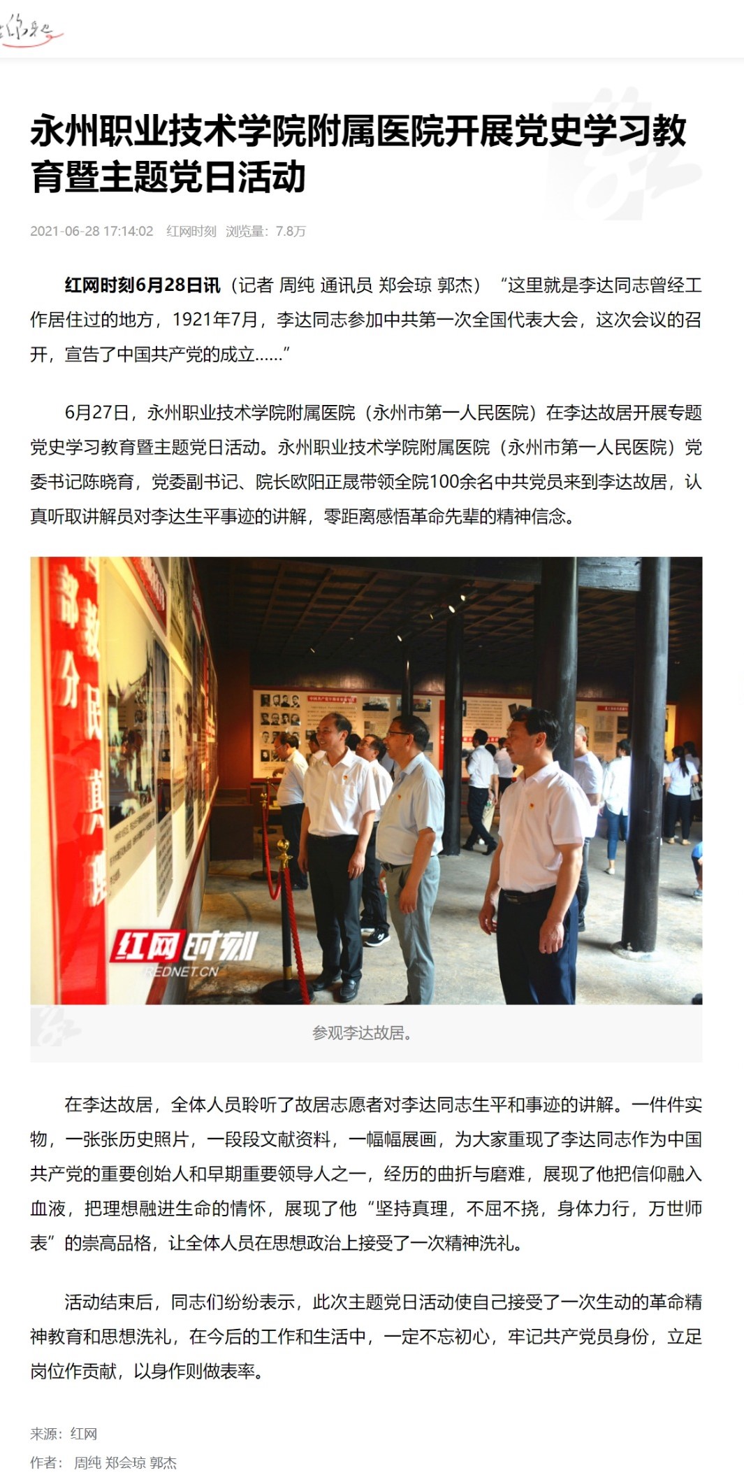 6月27日,永州职业技术学院附属医院(永州市第一人民医院)在李达故居开展专题党史学习教育暨主题党日活动。永州职业技术学院附属医院(永州市第一人民医院)党委书记陈晓育,党委副书记、院长欧阳正晟带领全院100余名中共党员来到李达故居,认真听取讲解员对李达生平事迹的讲解,零距离感悟革命先辈的精神信念。