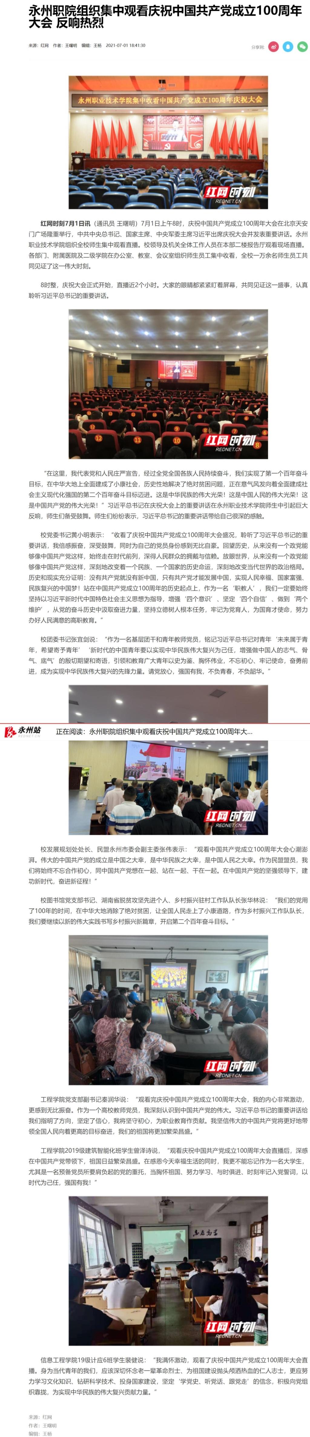 红网时刻7月1日讯(通讯员王曙明)7月1日上午8时,庆祝中国共产党成立100周年大会在北京天安门广场隆重举行,中共中央总书记、国家主席、中央军委主席习近平出席庆祝大会并发表重要讲话。永州职业技术学院组织全校师生集中观看直播。校领导及机关全体工作人员在本部二楼报告厅观看现场直播。各部门、附属医院及二级学院在办公室、教室、会议室组织师生员工集中收看,全校一万余名师生员工共同见证了这一伟大时刻。