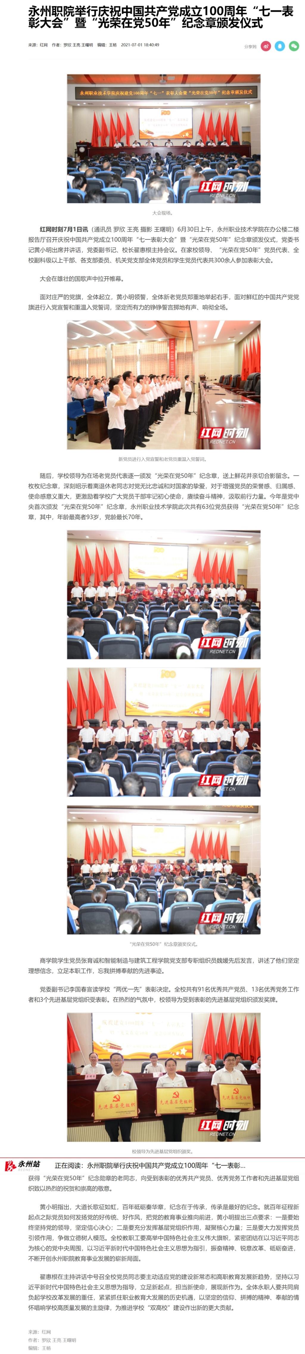 红网时刻7月1日讯(通讯员 罗欣 王亮 摄影 王曙明)6月30日上午,永州职业技术学院在办公楼二楼报告厅召开庆祝中国共产党成立100周年“七一表彰大会”暨“光荣在党50年”纪念章颁发仪式,党委书记黄小明出席并讲话,党委副书记、校长翟惠根主持会议。在家校领导、“光荣在党50年”党员代表、全校副科级以上干部、各支部委员、机关党支部全体党员和学生党员代表共300余人参加表彰大会。