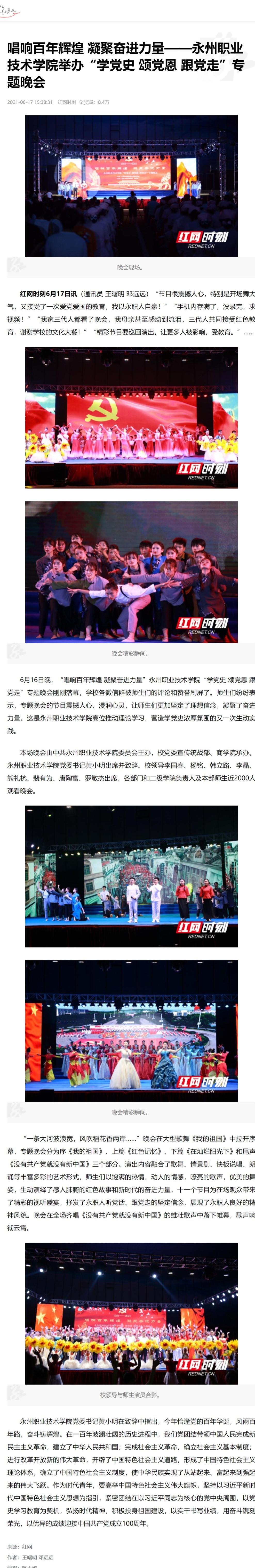 红网时刻6月17日讯(通讯员 王曙明 邓远远)“节目很震撼人心,特别是开场舞大气,又接受了一次爱党爱国的教育,我以永职人自豪!”“手机内存满了,没录完,求视频!”“我家三代人都看了晚会,我母亲甚至感动到流泪,三代人共同接受红色教育,谢谢学校的文化大餐!”“精彩节目要巡回演出,让更多人被影响,受教育。”……