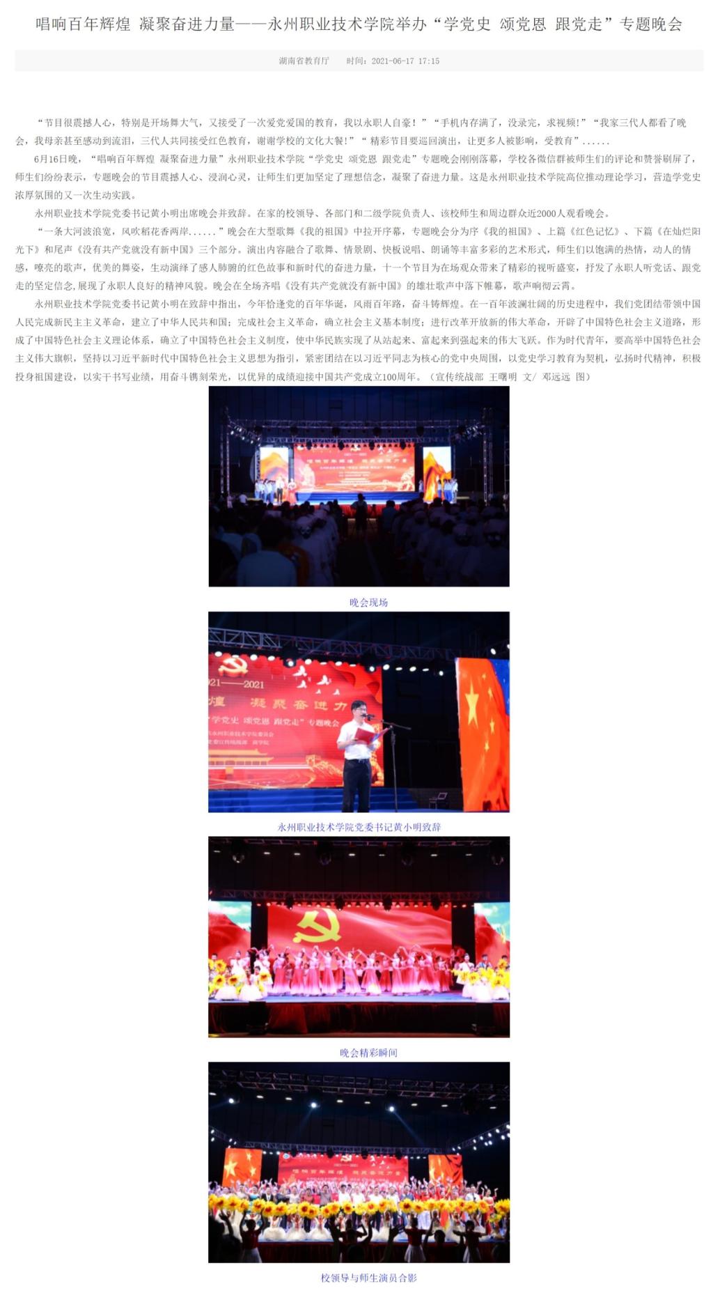 6月16日晚,“唱响百年辉煌 凝聚奋进力量”永州职业技术学院“学党史 颂党恩 跟党走”专题晚会刚刚落幕,学校各微信群被师生们的评论和赞誉刷屏了,师生们纷纷表示,专题晚会的节目震撼人心、浸润心灵,让师生们更加坚定了理想信念,凝聚了奋进力量。这是永州职业技术学院高位推动理论学习,营造学党史浓厚氛围的又一次生动实践。