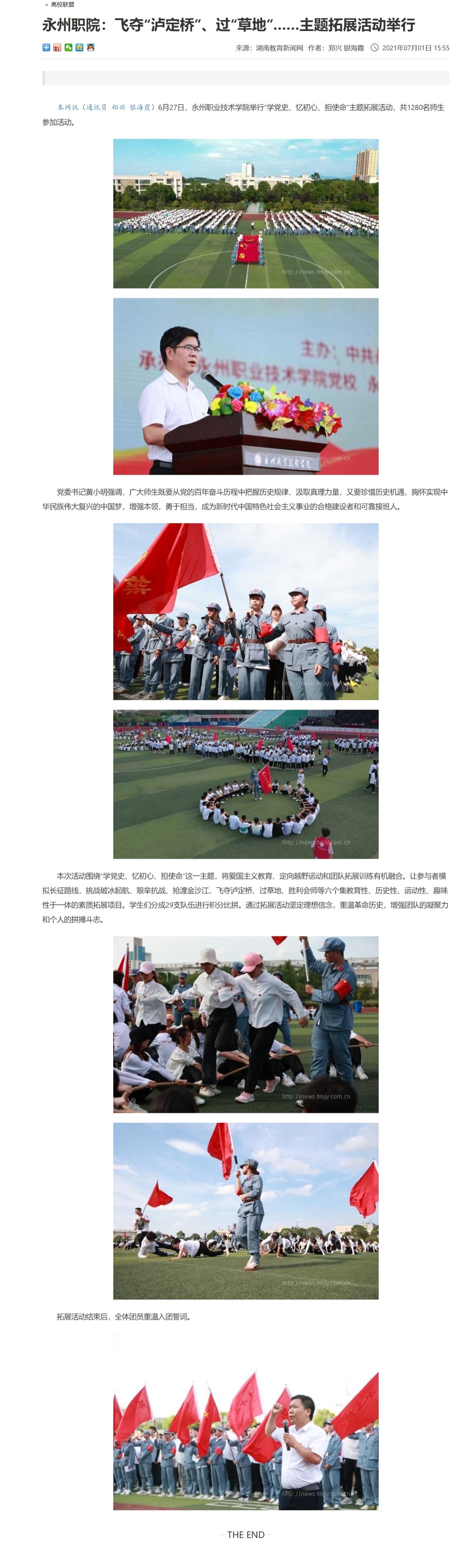 作者:郑兴 银海霞本网讯(通讯员 郑兴 银海霞)6月27日,永州职业技术学院举行“学党史、忆初心、担使命”主题拓展活动,共1280名师生参加活动。党委书记黄小明强调,广大师生既要从党的百年奋斗历程中把握历史规律、汲取真理力量,又要珍惜历史机遇,胸怀实现中华民族伟大复兴的中国梦,增强本领,勇于担当,成为新时代中国特色社会主义事业的合格建设者和可靠接班人。本次活动围绕“学党史、忆初心、担使命”这一主题,将爱国主义教育、定向越野运动和团队拓展训练有机融合。让参与者模拟长征路线,挑战破冰起航、艰辛抗战、抢渡金沙江、飞夺泸定桥、过草地、胜利会师等六个集教育性、历史性、运动性、趣味性于一体的素质拓展项目。学生们分成29支队伍进行积分比拼。通过拓展活动坚定理想信念,重温革命历史,增强团队的凝聚力和个人的拼搏斗志。拓展活动结束后,全体团员重温入团誓词。