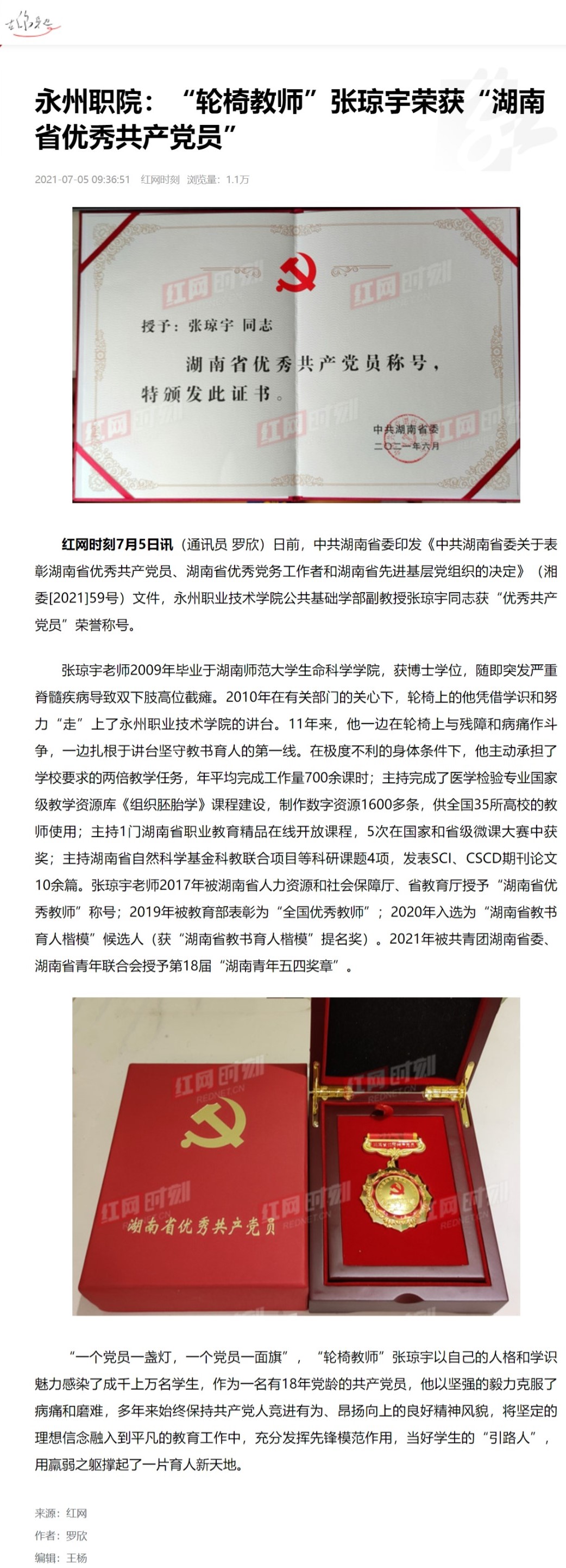 红网时刻7月5日讯(通讯员罗欣)日前,中共湖南省委印发《中共湖南省委关于表彰湖南省优秀共产党员、湖南省优秀党务工作者和湖南省先进基层党组织的决定》(湘委[2021]59号)文件,永州职业技术学院公共基础学部副教授张琼宇同志获“优秀共产党员”荣誉称号。张琼宇老师2009年毕业于湖南师范大学生命科学学院,获博士学位,随即突发严重脊髓疾病导致双下肢高位截瘫。2010年在有关部门的关心下,轮椅上的他凭借学识和努力“走”上了永州职业技术学院的讲台。11年来,他一边在轮椅上与残障和病痛作斗争,一边扎根于讲台坚守教书育人的第一线。在极度不利的身体条件下,他主动承担了学校要求的两倍教学任务,年平均完成工作量700余课时;主持完成了医学检验专业国家级教学资源库《组织胚胎学》课程建设,制作数字资源1600多条,供全国35所高校的教师使用;主持1门湖南省职业教育精品在线开放课程,5次在国家和省级微课大赛中获奖;主持湖南省自然科学基金科教联合项目等科研课题4项,发表SCI、CSCD期刊论文10余篇。张琼宇老师2017年被湖南省人力资源和社会保障厅、省教育厅授予“湖南省优秀教师”称号;2019年被教育部表彰为“全国优秀教师”;2020年入选为“湖南省教书育人楷模”候选人(获“湖南省教书育人楷模”提名奖)。2021年被共青团湖南省委、湖南省青年联合会授予第18届“湖南青年五四奖章”。“一个党员一盏灯,一个党员一面旗”,“轮椅教师”张琼宇以自己的人格和学识魅力感染了成千上万名学生,作为一名有18年党龄的共产党员,他以坚强的毅力克服了病痛和磨难,多年来始终保持共产党人竞进有为、昂扬向上的良好精神风貌,将坚定的理想信念融入到平凡的教育工作中,充分发挥先锋模范作用,当好学生的“引路人”,用羸弱之躯撑起了一片育人新天地。