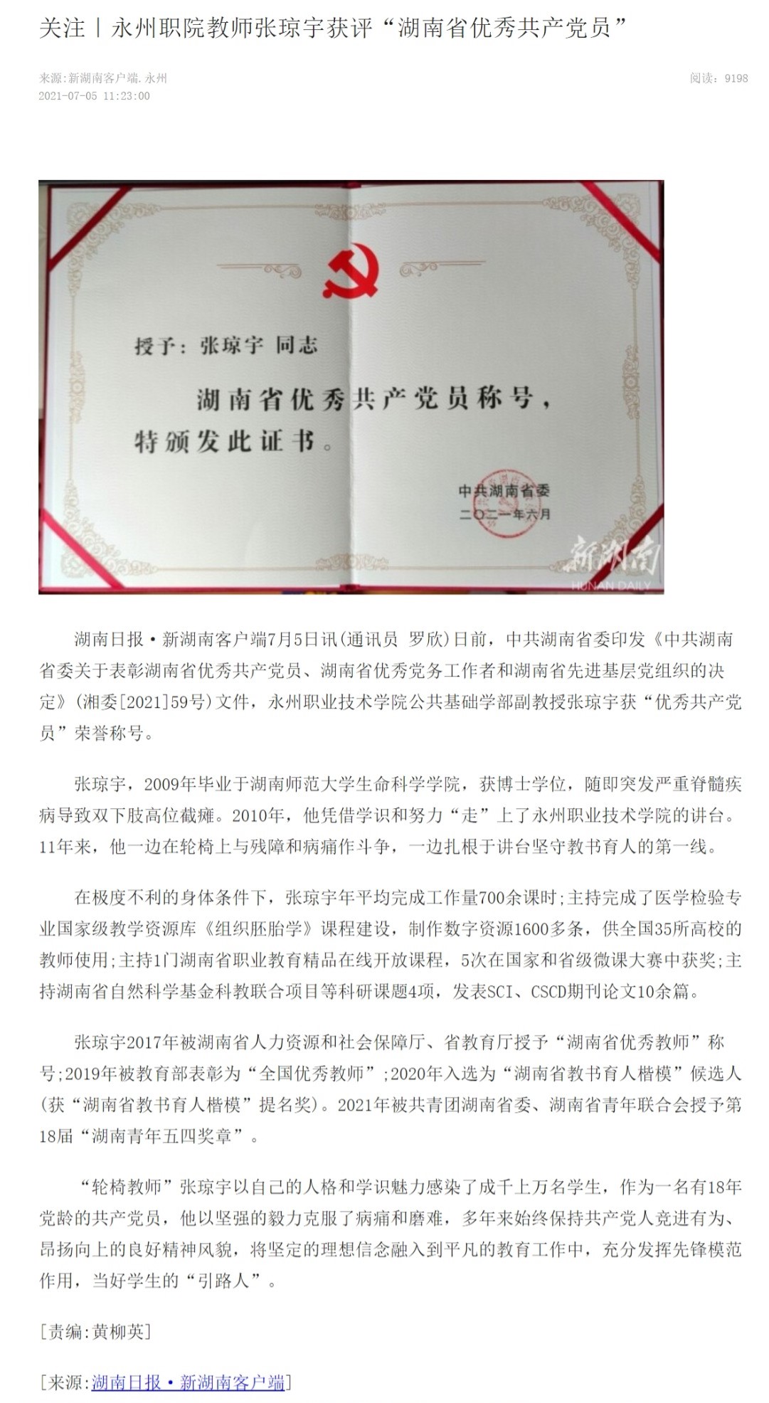 湖南日报·新湖南客户端7月5日讯(通讯员 罗欣)日前,中共湖南省委印发《中共湖南省委关于表彰湖南省优秀共产党员、湖南省优秀党务工作者和湖南省先进基层党组织的决定》(湘委[2021]59号)文件,永州职业技术学院公共基础学部副教授张琼宇获“优秀共产党员”荣誉称号。