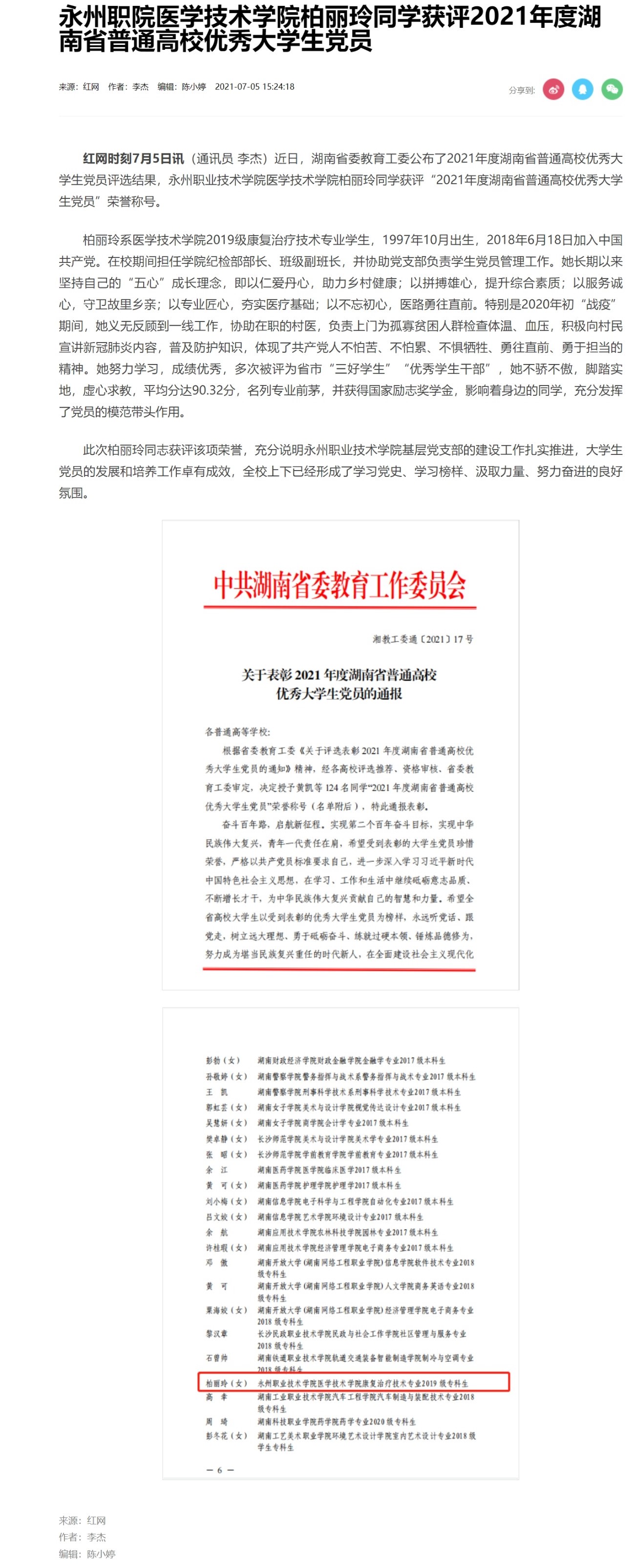 红网时刻7月5日讯(通讯员 李杰)近日,湖南省委教育工委公布了2021年度湖南省普通高校优秀大学生党员评选结果,永州职业技术学院医学技术学院柏丽玲同学获评“2021年度湖南省普通高校优秀大学生党员”荣誉称号。
