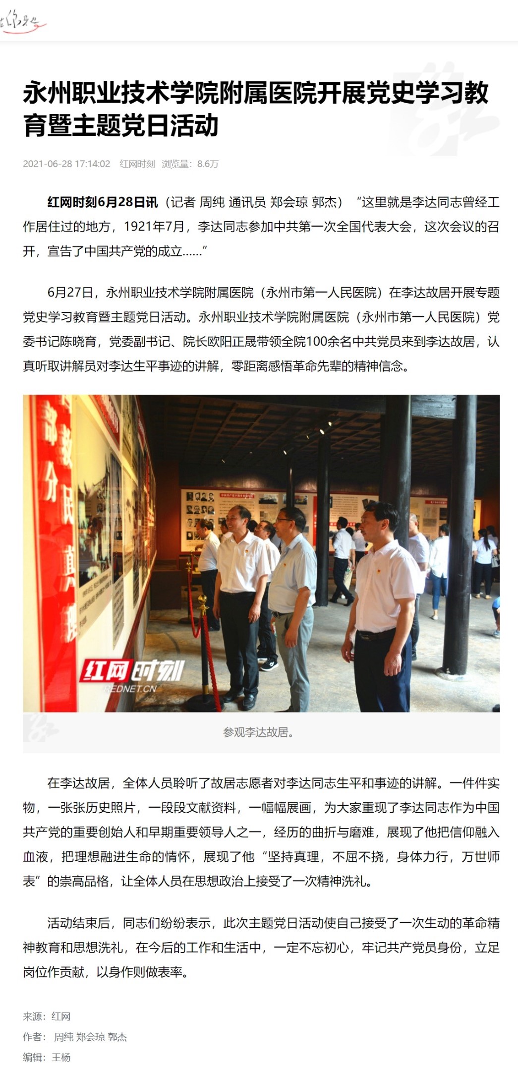 6月27日,永州职业技术学院附属医院(永州市第一人民医院)在李达故居开展专题党史学习教育暨主题党日活动。永州职业技术学院附属医院(永州市第一人民医院)党委书记陈晓育,党委副书记、院长欧阳正晟带领全院100余名中共党员来到李达故居,认真听取讲解员对李达生平事迹的讲解,零距离感悟革命先辈的精神信念。