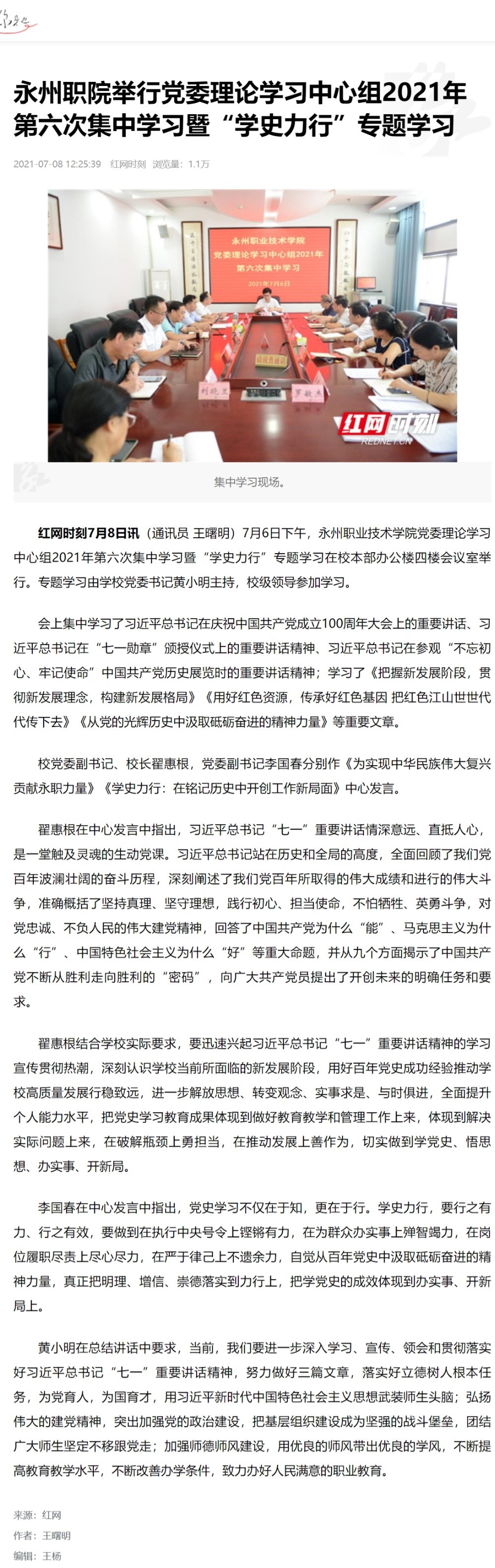 红网时刻7月8日讯(通讯员 王曙明)7月6日下午,永州职业技术学院党委理论学习中心组2021年第六次集中学习暨“学史力行”专题学习在校本部办公楼四楼会议室举行。专题学习由学校党委书记黄小明主持,校级领导参加学习。