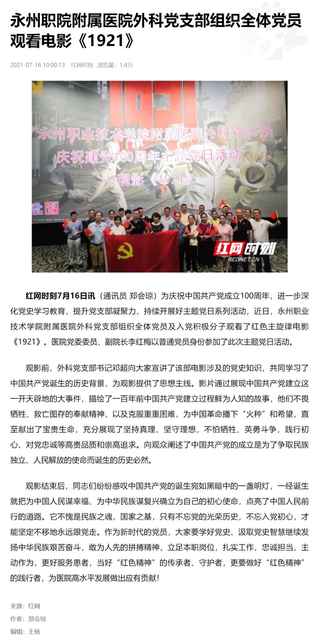 红网时刻7月16日讯(通讯员 郑会琼)为庆祝中国共产党成立100周年,进一步深化党史学习教育,提升党支部凝聚力,持续开展好主题党日系列活动,近日,永州职业技术学院附属医院外科党支部组织全体党员及入党积极分子观看了红色主旋律电影《1921》。医院党委委员、副院长李红梅以普通党员身份参加了此次主题党日活动。