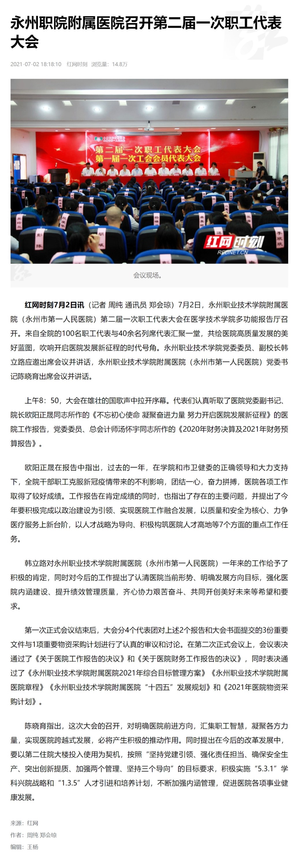 红网时刻7月2日讯(记者 周纯 通讯员 郑会琼)7月2日,永州职业技术学院附属医院(永州市第一人民医院)第二届一次职工代表大会在医学技术学院多功能报告厅召开。来自全院的100名职工代表与40余名列席代表汇聚一堂,共绘医院高质量发展的美好蓝图,吹响开启医院发展新征程的时代号角。永州职业技术学院党委委员、副校长韩立路应邀出席会议并讲话,永州职业技术学院附属医院(永州市第一人民医院)党委书记陈晓育出席会议并讲话。