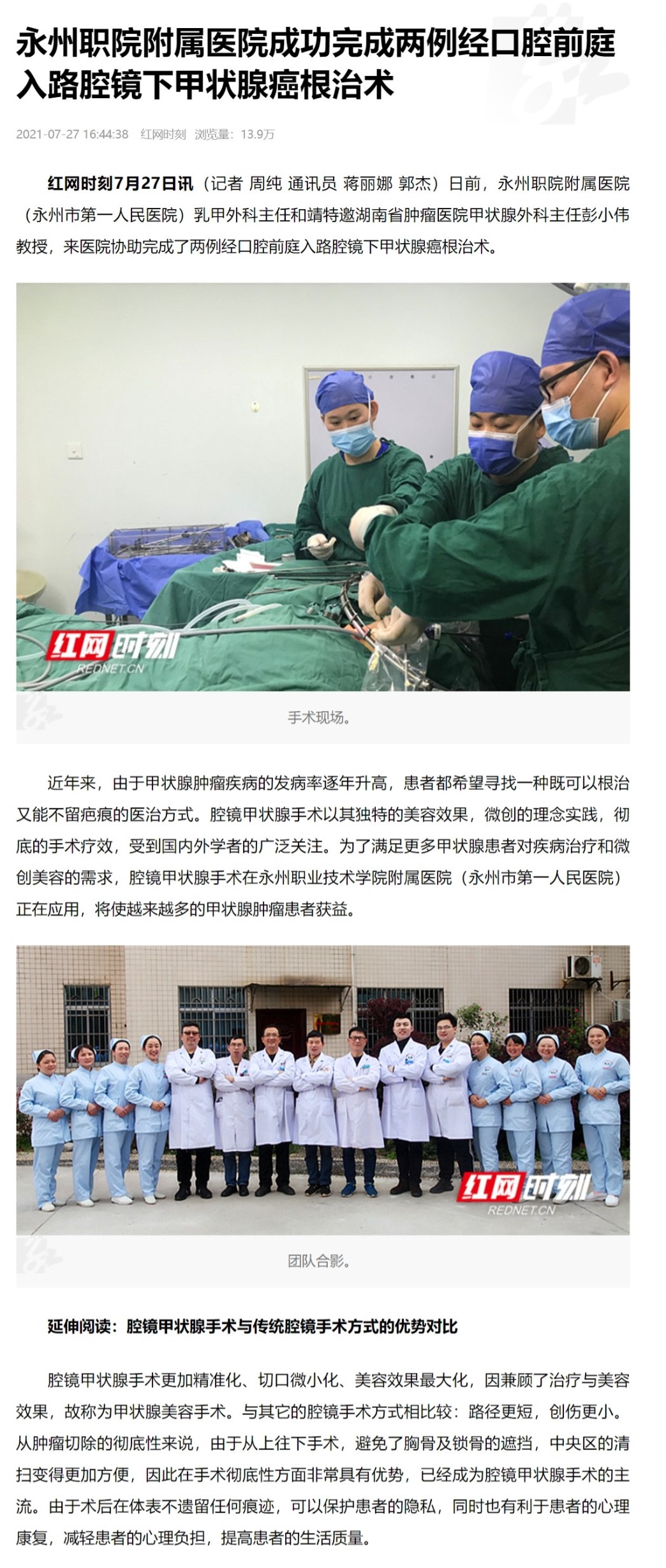 红网时刻7月27日讯(记者 周纯 通讯员 蒋丽娜 郭杰)日前,永州职院附属医院(永州市第一人民医院)乳甲外科主任和靖特邀湖南省肿瘤医院甲状腺外科主任彭小伟教授,来医院协助完成了两例经口腔前庭入路腔镜下甲状腺癌根治术。