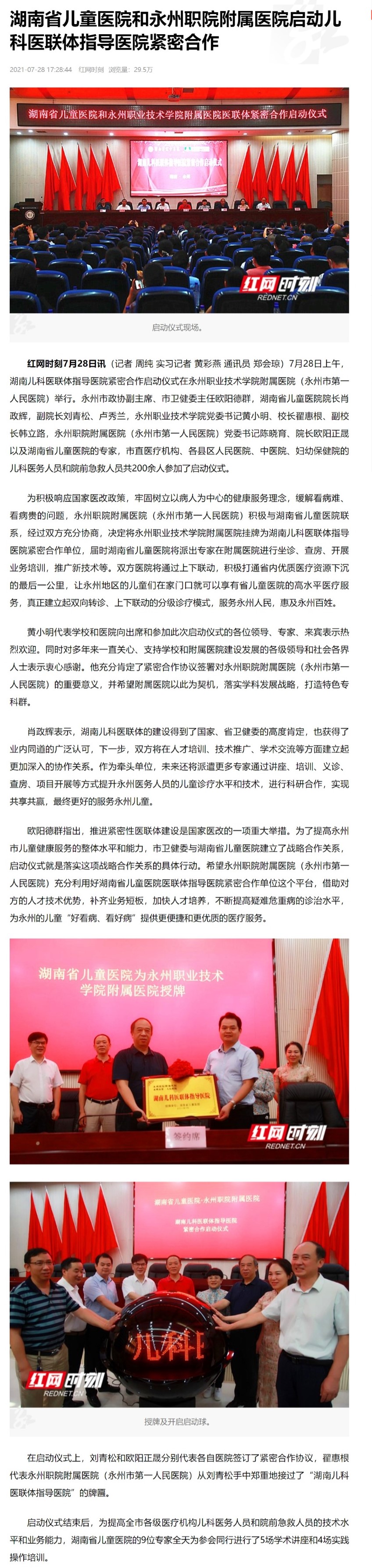 为积极响应国家医改政策,牢固树立以病人为中心的健康服务理念,缓解看病难、看病贵的问题,永州职院附属医院(永州市第一人民医院)积极与湖南省儿童医院联系,经过双方充分协商,决定将永州职业技术学院附属医院挂牌为湖南儿科医联体指导医院紧密合作单位,届时湖南省儿童医院将派出专家在附属医院进行坐诊、查房、开展业务培训,推广新技术等。双方医院将通过上下联动,积极打通省内优质医疗资源下沉的最后一公里,让永州地区的儿童们在家门口就可以享有省儿童医院的高水平医疗服务,真正建立起双向转诊、上下联动的分级诊疗模式,服务永州人民,惠及永州百姓。