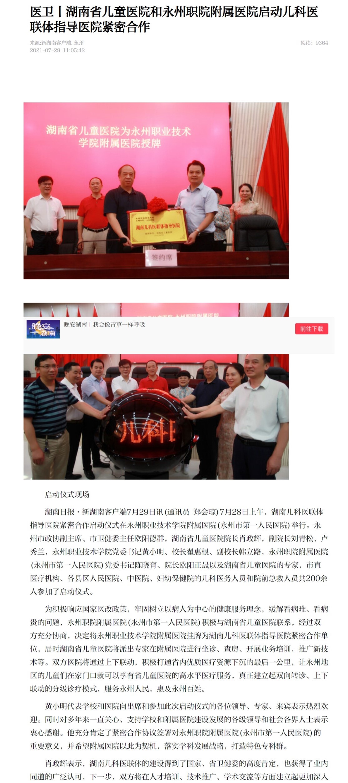 在启动仪式上,刘青松和欧阳正晟分别代表各自医院签订了紧密合作协议,翟惠根代表永州职院附属医院(永州市第一人民医院)从刘青松手中郑重地接过了“湖南儿科医联体指导医院”的牌匾。