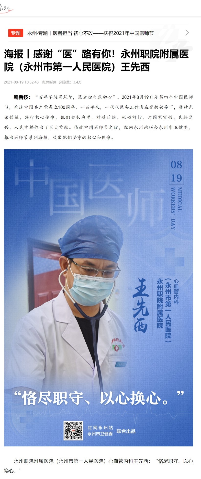 编者按:“百年华诞同筑梦,医者担当践初心”。2021年8月19日是第四个中国医师节,恰逢中国共产党成立100周年,一百年来,一代代医务工作者在党的领导下,赓续光荣传统,践行初心使命,他们白衣为甲,前赴后继、砥砺前行,为国家富强、民族复兴、人民幸福作出了巨大贡献。值此中国医师节之际,红网永州站联合永州市卫健委,推出医师节系列海报,致敬他们坚守的初心和使命。永州职院附属医院(永州市第一人民医院)心血管内科王先西:“恪尽职守、以心换心。”来源:红网作者:成文杰 丁菲菲 周纯 郭婳编辑:陈小婷