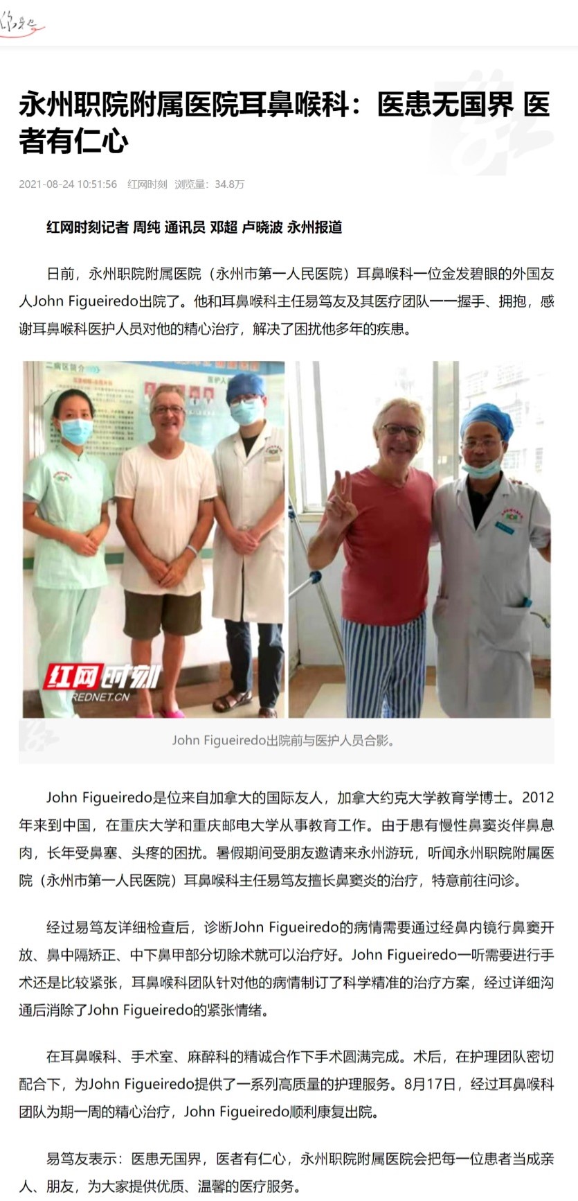 红网时刻记者 周纯 通讯员 邓超 卢晓波 永州报道日前,永州职院附属医院(永州市第一人民医院)耳鼻喉科一位金发碧眼的外国友人John Figueiredo出院了。他和耳鼻喉科主任易笃友及其医疗团队一一握手、拥抱,感谢耳鼻喉科医护人员对他的精心治疗,解决了困扰他多年的疾患。John Figueiredo是位来自加拿大的国际友人,加拿大约克大学教育学博士。2012年来到中国,在重庆大学和重庆邮电大学从事教育工作。由于患有慢性鼻窦炎伴鼻息肉,长年受鼻塞、头疼的困扰。暑假期间受朋友邀请来永州游玩,听闻永州职院附属医院(永州市第一人民医院)耳鼻喉科主任易笃友擅长鼻窦炎的治疗,特意前往问诊。经过易笃友详细检查后,诊断John Figueiredo的病情需要通过经鼻内镜行鼻窦开放、鼻中隔矫正、中下鼻甲部分切除术就可以治疗好。John Figueiredo一听需要进行手术还是比较紧张,耳鼻喉科团队针对他的病情制订了科学精准的治疗方案,经过详细沟通后消除了John Figueiredo的紧张情绪。在耳鼻喉科、手术室、麻醉科的精诚合作下手术圆满完成。术后,在护理团队密切配合下,为John Figueiredo提供了一系列高质量的护理服务。8月17日,经过耳鼻喉科团队为期一周的精心治疗,John Figueiredo顺利康复出院。易笃友表示:医患无国界,医者有仁心,永州职院附属医院会把每一位患者当成亲人、朋友,为大家提供优质、温馨的医疗服务。来源:红网作者:周纯 邓超 卢晓波编辑:王杨