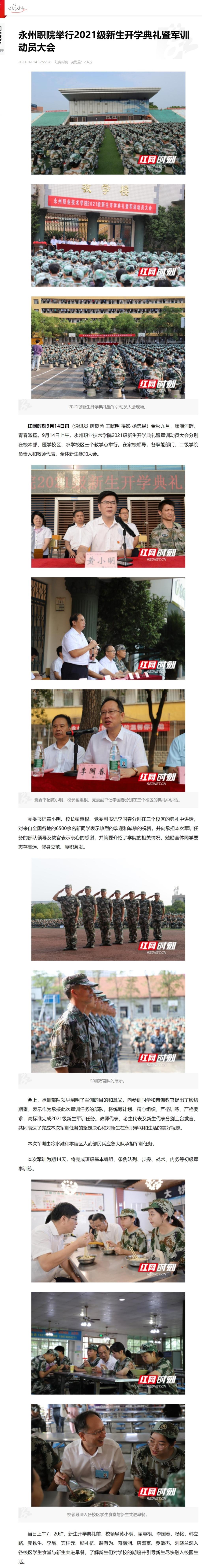 红网时刻9月14日讯(通讯员 唐良勇 王曙明 摄影 杨忠民)金秋九月,潇湘河畔,青春激扬。9月14日上午,永州职业技术学院2021级新生开学典礼暨军训动员大会分别在校本部、医学校区、农学校区三个教学点举行。在家校领导,各职能部门、二级学院负责人和教师代表、全体新生参加大会。党委书记黄小明、校长翟惠根、党委副书记李国春分别在三个校区的典礼中讲话,对来自全国各地的6500余名新同学表示热烈的欢迎和诚挚的祝贺,并向承担本次军训任务的部队领导及教官表示衷心的感谢,并简要介绍了学院的相关情况,勉励全体同学要志存高远、修身立范、厚积薄发。会上,承训部队领导阐明了军训的目的和意义,向参训同学和带训教官提出了殷切期望,表示作为承接此次军训任务的部队,将统筹计划、精心组织,严格训练、严格要求,高标准完成2021级新生军训任务。教师代表、老生代表及新生代表分别上台发言,共同表达了完成本次军训任务的坚定决心和对新生在永职学习和生活的美好祝愿。本次军训由冷水滩和零陵区人武部民兵应急大队承担军训任务。本次军训为期14天,将完成班级基本编组、条例队列、步操、战术、内务等初级军事训练。当日上午7:20许,新生开学典礼前,校领导黄小明、翟惠根、李国春、杨铭、韩立路、窦铁生、李晶、宾柱元、熊礼杭、裴有为、蒋衡湘、唐陶富、罗敏杰、刘晓兰深入各校区学生食堂与新生共进早餐,了解新生们对学校的期盼并引导新生尽快融入校园生活。来源:红网作者:唐良勇 王曙明 杨忠民编辑:王杨