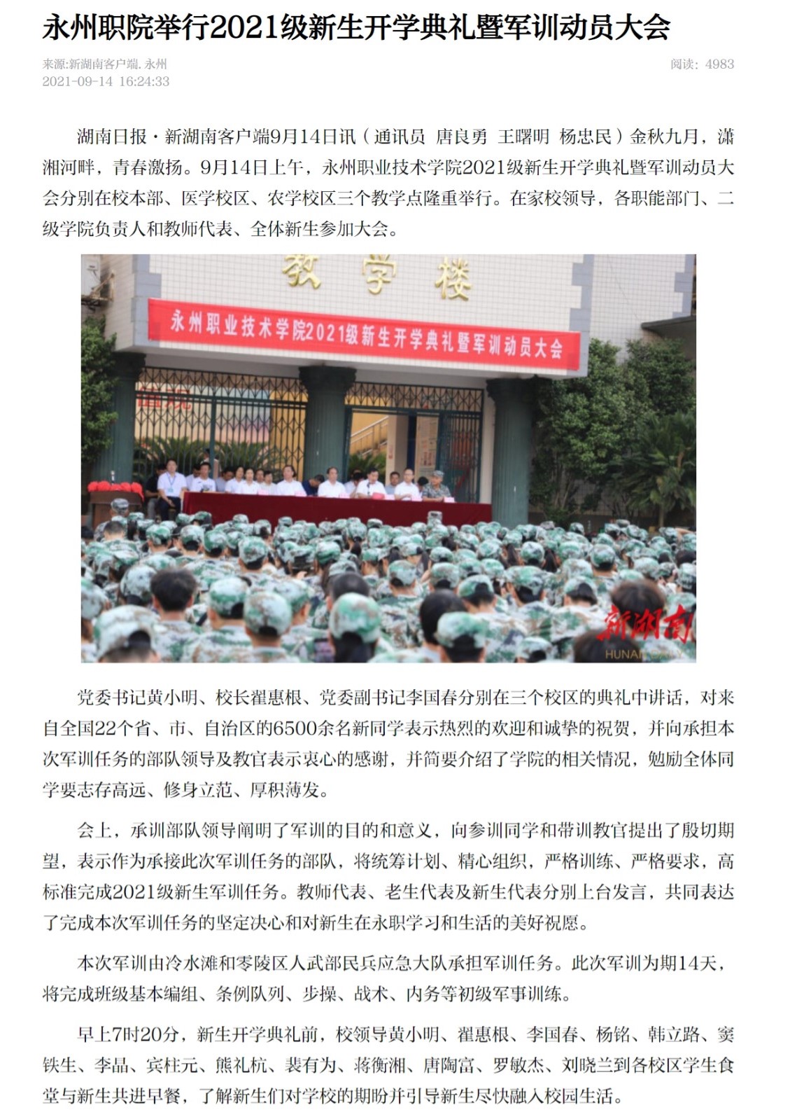 湖南日报·新湖南客户端9月14日讯(通讯员 唐良勇 王曙明 杨忠民)金秋九月,潇湘河畔,青春激扬。9月14日上午,永州职业技术学院2021级新生开学典礼暨军训动员大会分别在校本部、医学校区、农学校区三个教学点隆重举行。在家校领导,各职能部门、二级学院负责人和教师代表、全体新生参加大会。党委书记黄小明、校长翟惠根、党委副书记李国春分别在三个校区的典礼中讲话,对来自全国22个省、市、自治区的6500余名新同学表示热烈的欢迎和诚挚的祝贺,并向承担本次军训任务的部队领导及教官表示衷心的感谢,并简要介绍了学院的相关情况,勉励全体同学要志存高远、修身立范、厚积薄发。会上,承训部队领导阐明了军训的目的和意义,向参训同学和带训教官提出了殷切期望,表示作为承接此次军训任务的部队,将统筹计划、精心组织,严格训练、严格要求,高标准完成2021级新生军训任务。教师代表、老生代表及新生代表分别上台发言,共同表达了完成本次军训任务的坚定决心和对新生在永职学习和生活的美好祝愿。本次军训由冷水滩和零陵区人武部民兵应急大队承担军训任务。此次军训为期14天,将完成班级基本编组、条例队列、步操、战术、内务等初级军事训练。早上7时20分,新生开学典礼前,校领导黄小明、翟惠根、李国春、杨铭、韩立路、窦铁生、李晶、宾柱元、熊礼杭、裴有为、蒋衡湘、唐陶富、罗敏杰、刘晓兰到各校区学生食堂与新生共进早餐,了解新生们对学校的期盼并引导新生尽快融入校园生活