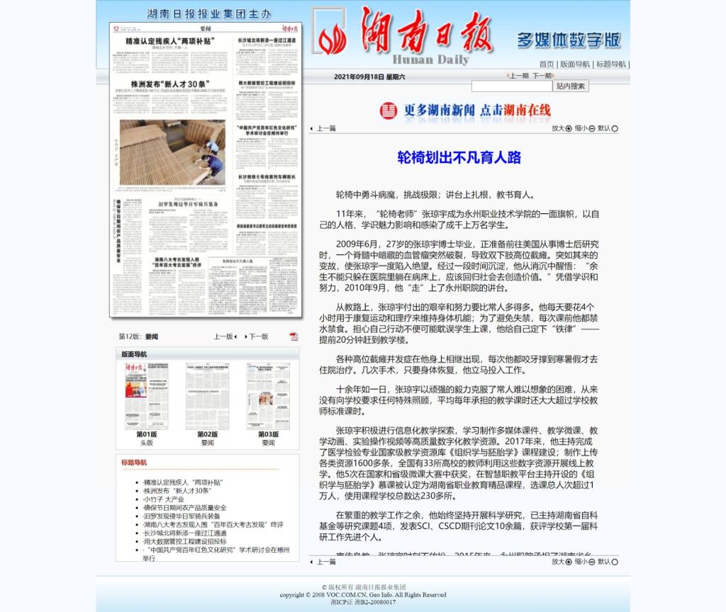 轮椅中勇斗病魔,挑战极限;讲台上扎根,教书育人。11年来,“轮椅老师”张琼宇成为永州职业技术学院的一面旗帜,以自己的人格、学识魅力影响和感染了成千上万名学生。2009年6月,27岁的张琼宇博士毕业,正准备前往美国从事博士后研究时,一个脊髓中暗藏的血管瘤突然破裂,导致双下肢高位截瘫。突如其来的变故,使张琼宇一度陷入绝望。经过一段时间沉淀,他从消沉中醒悟:“余生不能只躲在医院里躺在病床上,应该回归社会去创造价值。”凭借学识和努力,2010年9月,他“走”上了永州职院的讲台。从教路上,张琼宇付出的艰辛和努力要比常人多得多。他每天要花4个小时用于康复运动和理疗来维持身体机能;为了避免失禁,每次课前他都禁水禁食。担心自己行动不便可能耽误学生上课,他给自己定下“铁律”——提前20分钟赶到教学楼。各种高位截瘫并发症在他身上相继出现,每次他都咬牙撑到寒暑假才去住院治疗。几次手术,只要身体恢复,他立马投入工作。十余年如一日,张琼宇以顽强的毅力克服了常人难以想象的困难,从来没有向学校要求任何特殊照顾,平均每年承担的教学课时还大大超过学校教师标准课时。张琼宇积极进行信息化教学探索,学习制作多媒体课件、教学微课、教学动画、实验操作视频等高质量数字化教学资源。2017年来,他主持完成了医学检验专业国家级教学资源库《组织学与胚胎学》课程建设;制作上传各类资源1600多条,全国有33所高校的教师利用这些数字资源开展线上教学。他5次在国家和省级微课大赛中获奖,在智慧职教平台主持开设的《组织学与胚胎学》慕课被认定为湖南省职业教育精品课程,选课总人次超过1万人,使用课程学校总数达230多所。在繁重的教学工作之余,他始终坚持开展科学研究,已主持湖南省自科基金等研究课题4项,发表SCI、CSCD期刊论文10余篇,获评学校第一届科研工作先进个人。言传身教,张琼宇时刻不放松。2015年来,永州职院承担了湖南省乡村医生本土化培养任务,张琼宇主动承担乡村医生班的教学工作,把自己长期求医的所见所闻所感融入教学,激发学生的学习兴趣和信心。他教导学生既要看到病,也要看到人,要特别关注病人的心理。“张老师的课,没有同学迟到早退,他坐在轮椅上都能做到的事,我们有什么理由做不到。”他用自己独特的方式助力乡村医学班学生连续在省统一考试中取得优异成绩。“教师这个职业让我再次拥有信心和力量去追求生命的宽度和厚度!”张琼宇说。11年间,他曾获全国优秀教师、湖南省首届“教书育人楷模”提名奖、湖南省优秀教师等荣誉。今年,又被授予第18届“湖南青年五四奖章”,获“湖南省优秀共产党员”称号。(王曙明)