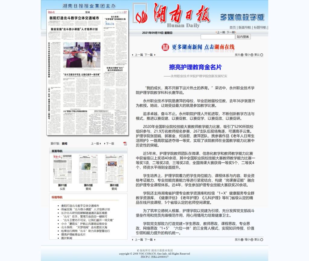 “我的成长,离不开脚下这片热土的养育。”采访中,永州职业技术学院护理学院教学科科长唐萍说。永州职业技术学院是唐萍的母校,毕业后她留校任教,去年36岁就晋升为教授。她说,让她受益最大的就是参加教学比赛。追求卓越,奋斗不止。永州职院护理人开拓进取,不断创新教学方法与模式,推进以赛促建、以赛促教、以赛促学、以赛促改、以赛促研。2020年全国职业院校技能大赛教师教学能力比赛,吸引了5290所院校组织参与、21.9万名教师报名参赛、267支队伍现场角逐,可谓高手云集。护理学院张丽娟、郭赛金、何淑君、唐萍团队,携参赛作品《老年人日常生活照护》一路高歌猛进夺得一等奖,实现了该院教师在全国教学能力比赛中历史性的突破。近5年来,护理学院教师团队在微课、信息化教学和教师教学能力比赛中获省级以上奖项40余项,其中全国职业院校技能大赛教师教学能力比赛一等奖1项、二等奖2项、三等奖2项,全国微课大赛获得一等奖5个、二等奖4个,师资水平得到全面提升。学生培养上,护理学院着力把学生岗位能力、课程体系与内容、职业资格考证能力、专业技能竞赛能力等进行紧密结合,构建“岗课赛证能”融合的护理专业课程体系。近4年,学生参加护理专业技能大赛获奖20余项。学院还主持湖南省护理专业教学资源库和校级“1+X”健康服务专业群教学资源库,《健康评估》《老年护理》《儿科护理》等8门省级认定的精品在线开放课程,5个省级认定的名师空间课堂。
