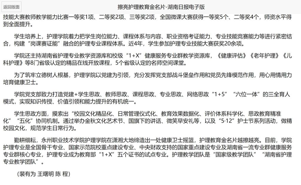 “我的成长,离不开脚下这片热土的养育。”采访中,永州职业技术学院护理学院教学科科长唐萍说。永州职业技术学院是唐萍的母校,毕业后她留校任教,去年36岁就晋升为教授。她说,让她受益最大的就是参加教学比赛。追求卓越,奋斗不止。永州职院护理人开拓进取,不断创新教学方法与模式,推进以赛促建、以赛促教、以赛促学、以赛促改、以赛促研。2020年全国职业院校技能大赛教师教学能力比赛,吸引了5290所院校组织参与、21.9万名教师报名参赛、267支队伍现场角逐,可谓高手云集。护理学院张丽娟、郭赛金、何淑君、唐萍团队,携参赛作品《老年人日常生活照护》一路高歌猛进夺得一等奖,实现了该院教师在全国教学能力比赛中历史性的突破。近5年来,护理学院教师团队在微课、信息化教学和教师教学能力比赛中获省级以上奖项40余项,其中全国职业院校技能大赛教师教学能力比赛一等奖1项、二等奖2项、三等奖2项,全国微课大赛获得一等奖5个、二等奖4个,师资水平得到全面提升。学生培养上,护理学院着力把学生岗位能力、课程体系与内容、职业资格考证能力、专业技能竞赛能力等进行紧密结合,构建“岗课赛证能”融合的护理专业课程体系。近4年,学生参加护理专业技能大赛获奖20余项。学院还主持湖南省护理专业教学资源库和校级“1+X”健康服务专业群教学资源库,《健康评估》《老年护理》《儿科护理》等8门省级认定的精品在线开放课程,5个省级认定的名师空间课堂。为了筑牢立德树人根基,护理学院以党建为引领,充分发挥党支部战斗堡垒作用和党员先锋模范作用,用心用情用力培育健康卫士。