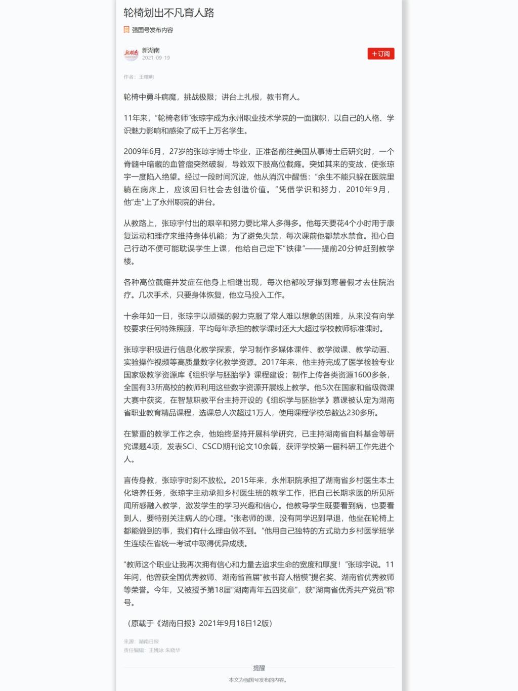 作者:王曙明轮椅中勇斗病魔,挑战极限;讲台上扎根,教书育人。11年来,“轮椅老师”张琼宇成为永州职业技术学院的一面旗帜,以自己的人格、学识魅力影响和感染了成千上万名学生。2009年6月,27岁的张琼宇博士毕业,正准备前往美国从事博士后研究时,一个脊髓中暗藏的血管瘤突然破裂,导致双下肢高位截瘫。突如其来的变故,使张琼宇一度陷入绝望。经过一段时间沉淀,他从消沉中醒悟:“余生不能只躲在医院里躺在病床上,应该回归社会去创造价值。”凭借学识和努力,2010年9月,他“走”上了永州职院的讲台。从教路上,张琼宇付出的艰辛和努力要比常人多得多。他每天要花4个小时用于康复运动和理疗来维持身体机能;为了避免失禁,每次课前他都禁水禁食。担心自己行动不便可能耽误学生上课,他给自己定下“铁律”——提前20分钟赶到教学楼。各种高位截瘫并发症在他身上相继出现,每次他都咬牙撑到寒暑假才去住院治疗。几次手术,只要身体恢复,他立马投入工作。十余年如一日,张琼宇以顽强的毅力克服了常人难以想象的困难,从来没有向学校要求任何特殊照顾,平均每年承担的教学课时还大大超过学校教师标准课时。张琼宇积极进行信息化教学探索,学习制作多媒体课件、教学微课、教学动画、实验操作视频等高质量数字化教学资源。2017年来,他主持完成了医学检验专业国家级教学资源库《组织学与胚胎学》课程建设;制作上传各类资源1600多条,全国有33所高校的教师利用这些数字资源开展线上教学。他5次在国家和省级微课大赛中获奖,在智慧职教平台主持开设的《组织学与胚胎学》慕课被认定为湖南省职业教育精品课程,选课总人次超过1万人,使用课程学校总数达230多所。在繁重的教学工作之余,他始终坚持开展科学研究,已主持湖南省自科基金等研究课题4项,发表SCI、CSCD期刊论文10余篇,获评学校第一届科研工作先进个人。言传身教,张琼宇时刻不放松。2015年来,永州职院承担了湖南省乡村医生本土化培养任务,张琼宇主动承担乡村医生班的教学工作,把自己长期求医的所见所闻所感融入教学,激发学生的学习兴趣和信心。他教导学生既要看到病,也要看到人,要特别关注病人的心理。“张老师的课,没有同学迟到早退,他坐在轮椅上都能做到的事,我们有什么理由做不到。”他用自己独特的方式助力乡村医学班学生连续在省统一考试中取得优异成绩。“教师这个职业让我再次拥有信心和力量去追求生命的宽度和厚度!”张琼宇说。11年间,他曾获全国优秀教师、湖南省首届“教书育人楷模”提名奖、湖南省优秀教师等荣誉。今年,又被授予第18届“湖南青年五四奖章”,获“湖南省优秀共产党员”称号。(原载于《湖南日报》2021年9月18日12版)来源:湖南日报责任编辑:王姚冰 朱晓华
