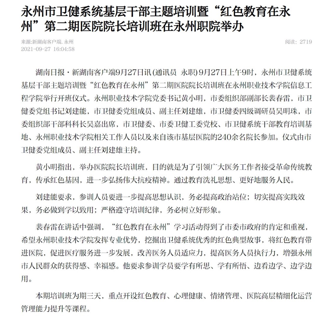 湖南日报·新湖南客户端9月27日讯(通讯员 永职)9月27日上午9时,永州市卫健系统基层干部主题培训暨“红色教育在永州”第二期医院院长培训班在永州职业技术学院信息工程学院举行开班仪式。永州职业技术学院党委书记黄小明,市委组织部副部长裴春雷,市卫健委党组书记刘建能,市卫健委党组成员、副主任刘建雄,市卫健委四级调研员吴明珠,市委组织部干部科科长吴嘉出席,市卫健委、市委卫健工委党校、市卫健系统干部教育培训基地、永州职业技术学院相关工作人员以及来自该市基层医院的240余名院长参加。仪式由市卫健委党组成员、副主任刘建雄主持。黄小明指出,举办医院院长培训班,目的就是为了引领广大医务工作者接受革命传统教育,传承红色基因,进一步弘扬伟大抗疫精神。通过教育洗礼思想、更好地服务人民。刘建能要求,参训人员要进一步提高思想认识,务必提高政治站位;切实提高实践效果,务必做到学以致用;严格遵守培训纪律,务必树立好形象。裴春雷在讲话中强调,“红色教育在永州”学习活动得到了市委市政府的肯定和重视,希望永州职业技术学院发挥专业优势,挖掘出卫健系统优秀的红色典型故事,将红色教育带进医院,促进医疗服务进一步发展,改善医务人员适应力,提高医务人员执行力,增强永州市人民群众的获得感、幸福感。他要求参训学员要学有所思、学有所悟、边看边学、边学边用。本期培训班为期三天,重点开设红色教育、心理健康、情绪管理、医院高层精细化运营管理能力提升等课程。