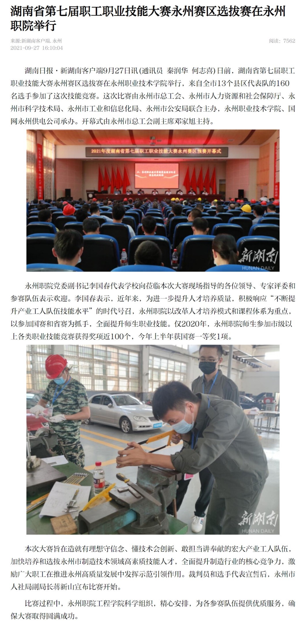 湖南日报·新湖南客户端9月27日讯(通讯员 秦润华 何志喜)日前,湖南省第七届职工职业技能大赛永州赛区选拔赛在永州职业技术学院举行,来自全市13个县区代表队的160名选手参加了这次技能竞赛。这次比赛由永州市总工会、永州市人力资源和社会保障厅、永州市科学技术局、永州市工业和信息化局、永州市公安局联合主办,永州职业技术学院、国网永州供电公司承办。开幕式由永州市总工会副主席邓家旭主持。永州职院党委副书记李国春代表学校向莅临本次大赛现场指导的各位领导、专家评委和参赛队伍表示欢迎。李国春表示,近年来,为进一步提升人才培养质量,积极响应“不断提升产业工人队伍技能水平”的时代号召,永州职院以改革人才培养模式和课程体系为重点,以参加国赛和省赛为抓手,全面提升师生职业技能。仅2020年,永州职院师生参加市级以上各类职业技能竞赛获得奖项近100个,今年上半年获国赛一等奖1项。本次大赛旨在造就有理想守信念、懂技术会创新、敢担当讲奉献的宏大产业工人队伍,加快培养和选拔永州市制造技术领域高素质技能人才,全面提升制造行业的核心竞争力,激励广大职工在推进永州高质量发展中发挥示范引领作用。裁判员和选手代表宣誓后,永州市人社局副局长蒋新山宣布比赛开始。比赛过程中,永州职院工程学院科学组织,精心安排,为各参赛队伍提供优质服务,确保大赛取得圆满成功。