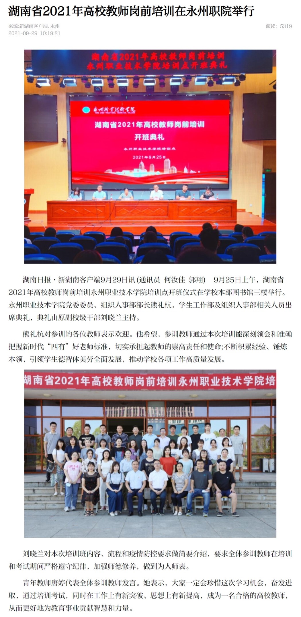 湖南日报·新湖南客户端9月29日讯(通讯员 何汝佳 郭翔) 9月25日上午,湖南省2021年高校教师岗前培训永州职业技术学院培训点开班仪式在学校本部图书馆三楼举行。永州职业技术学院党委委员、组织人事部部长熊礼杭,学生工作部及组织人事部相关人员出席典礼,典礼由原副校级干部刘晓兰主持。熊礼杭对参训的各位教师表示欢迎。他希望,参训教师通过本次培训能深刻领会和准确把握新时代“四有”好老师标准,切实承担起教师的崇高责任和使命;不断积累经验、锤炼本领,引领学生德智体美劳全面发展,推动学校各项工作高质量发展。刘晓兰对本次培训班内容、流程和疫情防控要求做简要介绍,要求全体参训教师在培训和考试期间严格遵守纪律,加强师德修养,做到为人师表。青年教师唐婷代表全体参训教师发言。她表示,大家一定会珍惜这次学习机会,奋发进取,通过培训考试,同时在工作上有新突破、思想上有新提高,成为一名合格的高校教师,从而更好地为教育事业贡献智慧和力量。