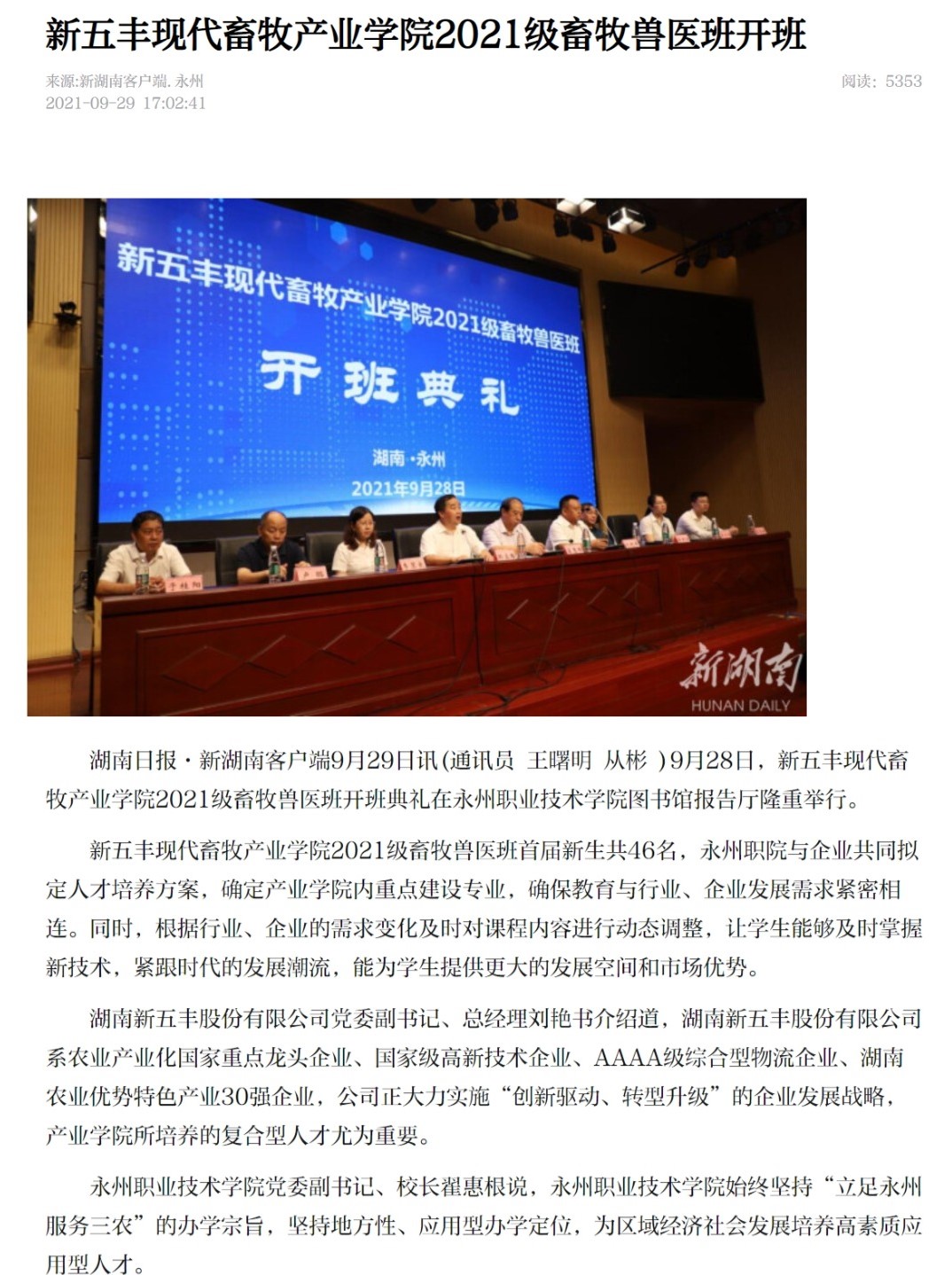 湖南日报·新湖南客户端9月29日讯(通讯员 王曙明 从彬 )9月28日,新五丰现代畜牧产业学院2021级畜牧兽医班开班典礼在永州职业技术学院图书馆报告厅隆重举行。新五丰现代畜牧产业学院2021级畜牧兽医班首届新生共46名,永州职院与企业共同拟定人才培养方案,确定产业学院内重点建设专业,确保教育与行业、企业发展需求紧密相连。同时,根据行业、企业的需求变化及时对课程内容进行动态调整,让学生能够及时掌握新技术,紧跟时代的发展潮流,能为学生提供更大的发展空间和市场优势。湖南新五丰股份有限公司党委副书记、总经理刘艳书介绍道,湖南新五丰股份有限公司系农业产业化国家重点龙头企业、国家级高新技术企业、AAAA级综合型物流企业、湖南农业优势特色产业30强企业,公司正大力实施“创新驱动、转型升级”的企业发展战略,产业学院所培养的复合型人才尤为重要。永州职业技术学院党委副书记、校长翟惠根说,永州职业技术学院始终坚持“立足永州 服务三农”的办学宗旨,坚持地方性、应用型办学定位,为区域经济社会发展培养高素质应用型人才。