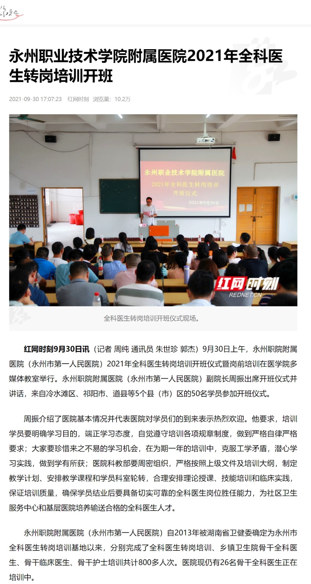 红网时刻9月30日讯(记者 周纯 通讯员 朱世珍 郭杰)9月30日上午,永州职院附属医院(永州市第一人民医院)2021年全科医生转岗培训开班仪式暨岗前培训在医学院多媒体教室举行。永州职院附属医院(永州市第一人民医院)副院长周振出席开班仪式并讲话,来自冷水滩区、祁阳市、道县等5个县(市)区的50名学员参加开班仪式。周振介绍了医院基本情况并代表医院对学员们的到来表示热烈欢迎。他要求,培训学员要明确学习目的,端正学习态度,自觉遵守培训各项规章制度,做到严格自律严格要求;大家要珍惜来之不易的学习机会,在为期一年的培训中,克服工学矛盾,潜心学习实践,做到学有所获;医院科教部要周密组织,严格按照上级文件及培训大纲,制定教学计划、安排教学课程和学员科室轮转,合理安排理论授课、技能培训和临床实践,保证培训质量,确保学员结业后要具备切实可靠的全科医生岗位胜任能力,为社区卫生服务中心和基层医院培养输送合格的全科医生人才。永州职院附属医院(永州市第一人民医院)自2013年被湖南省卫健委确定为永州市全科医生转岗培训基地以来,分别完成了全科医生转岗培训、乡镇卫生院骨干全科医生、骨干临床医生、骨干护士培训共计800多人次。医院现仍有26名骨干全科医生正在培训中。来源:红网作者:周纯 朱世珍 郭杰编辑:王杨