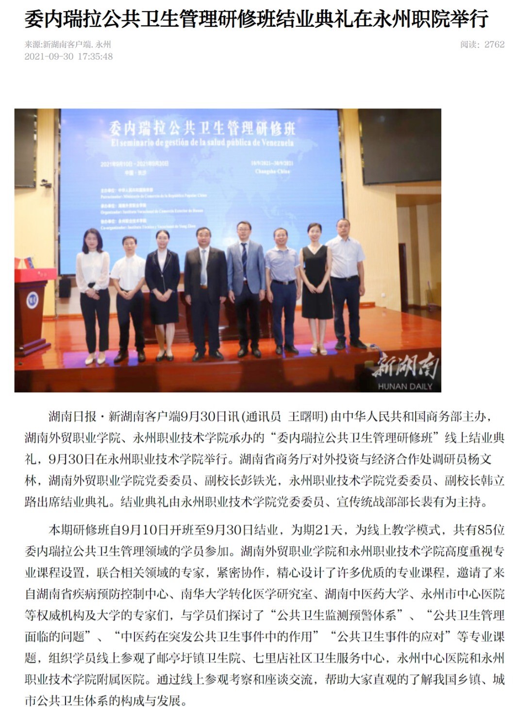 湖南日报·新湖南客户端9月30日讯(通讯员 王曙明)由中华人民共和国商务部主办,湖南外贸职业学院、永州职业技术学院承办的“委内瑞拉公共卫生管理研修班”线上结业典礼,9月30日在永州职业技术学院举行。湖南省商务厅对外投资与经济合作处调研员杨文林,湖南外贸职业学院党委委员、副校长彭铁光,永州职业技术学院党委委员、副校长韩立路出席结业典礼。结业典礼由永州职业技术学院党委委员、宣传统战部部长裴有为主持。本期研修班自9月10日开班至9月30日结业,为期21天,为线上教学模式,共有85位委内瑞拉公共卫生管理领域的学员参加。湖南外贸职业学院和永州职业技术学院高度重视专业课程设置,联合相关领域的专家,紧密协作,精心设计了许多优质的专业课程,邀请了来自湖南省疾病预防控制中心、南华大学转化医学研究室、湖南中医药大学、永州市中心医院等权威机构及大学的专家们,与学员们探讨了“公共卫生监测预警体系”、“公共卫生管理面临的问题”、“中医药在突发公共卫生事件中的作用”“公共卫生事件的应对”等专业课题,组织学员线上参观了邮亭圩镇卫生院、七里店社区卫生服务中心,永州中心医院和永州职业技术学院附属医院。通过线上参观考察和座谈交流,帮助大家直观的了解我国乡镇、城市公共卫生体系的构成与发展。
